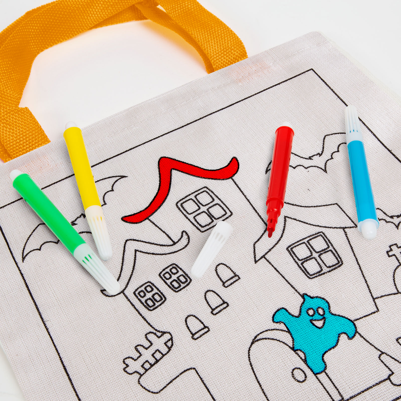 Vybarvi si sám tašku s fixy. Dva v jednom: taška a aktivita pro děti. Při barvení je třeba vložit mezi dva materiály sáčku silnější papír, aby se barva nedostala na zadní stranu.
