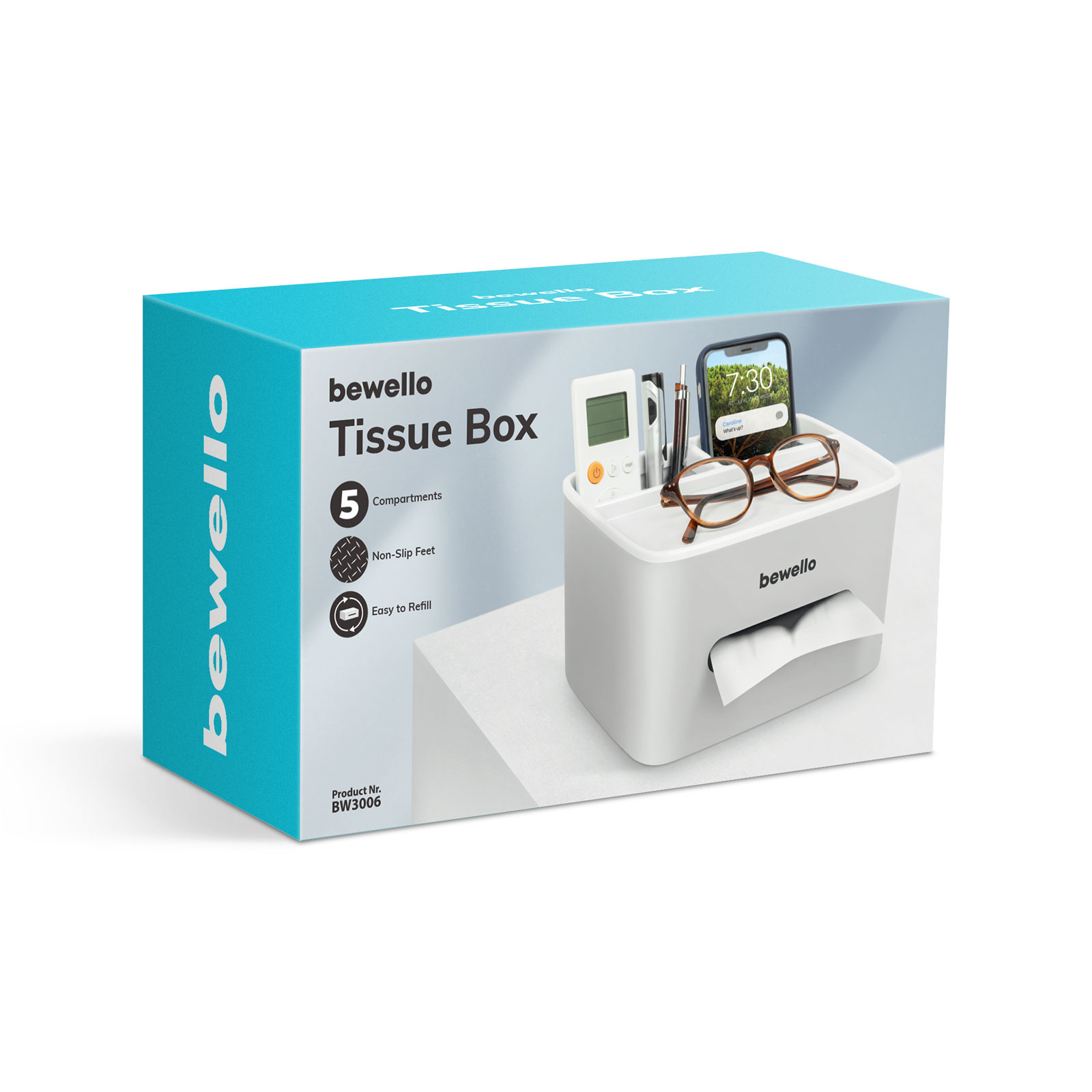 Uchovávejte své kapesníky a čisticí ubrousky v tomto držáku. Díky otvoru na boční straně se snadno dostanete ke kapesníkům nebo ubrouskům, aniž by byly na očích. Otvory v horní části mohou být vhodné pro uložení kancelářských potřeb nebo mobilního telefonu. Ideální volba do ložnice, koupelny nebo kanceláře.