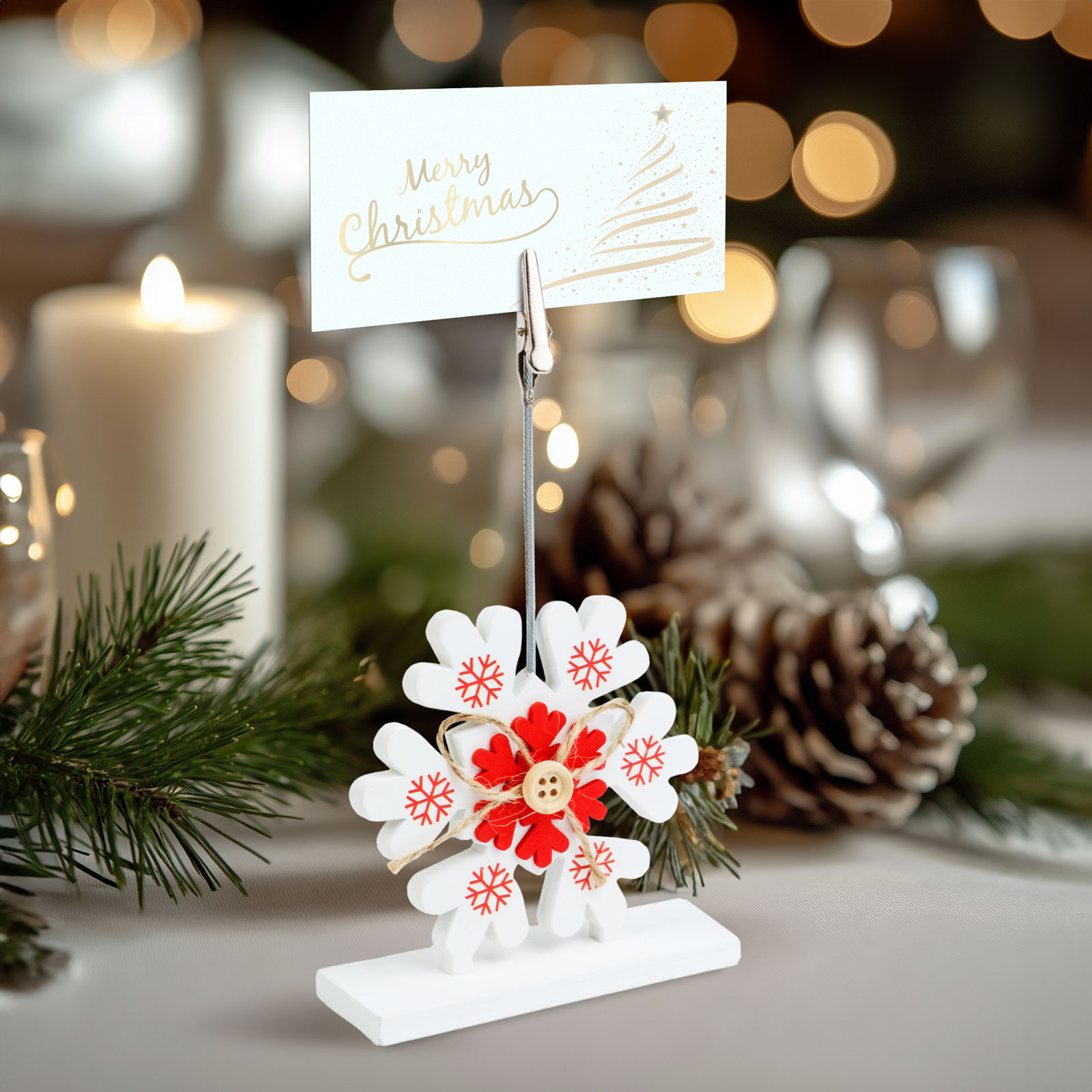 Tento vánoční držák na jmenovky je ideální volbou pro jakoukoli slavnostní událost, oběd nebo večeři. Označte místo svých hostů u stolu nebo jim jednoduše popřejte veselé Vánoce! Pohlednice je vyrobena ze dřeva, které je odolným a ekologickým materiálem a zároveň přispívá ke sváteční výzdobě. Jmenovku jednoduše připevníte pomocí spony na vrchu. Díky svému jedinečnému a útulnému vzhledu je úspěch zaručen!