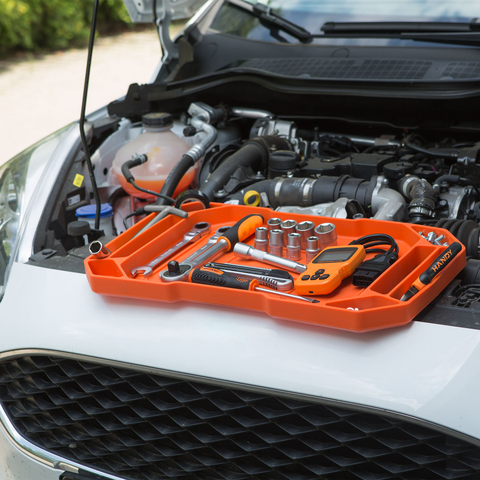 Inovativní produkt v různých velikostech, který usnadní uložení nářadí během montážních prací. Ruční nářadí se při používání často zašpiní, tomu můžete předejít, pokud je budete ukládat na tácek. Potřebné šrouby a součástky můžete skladovat odděleně. Při ukládání nářadí absorbuje nárazy, díky čemuž se povrch nemůže poškodit. Může být ideální pro montážní práce kolem domu, elektrické montáže, renovace nebo při opravě auta. Gumové tácky 11985A, 11985B, 11985C lze uložit na sebe a mohou tvořit sadu.