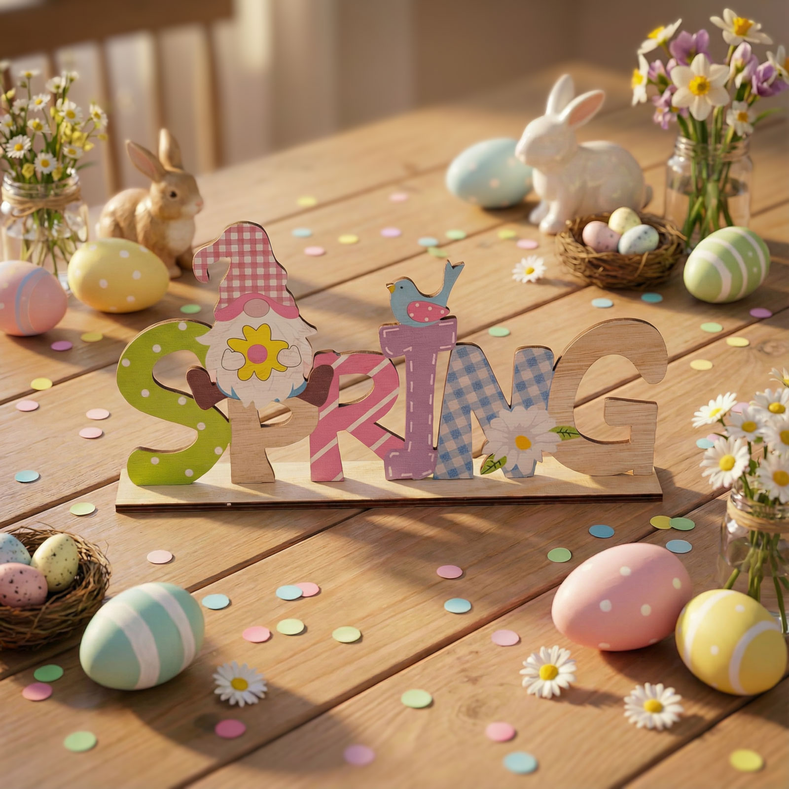 Oživte svůj sváteční stůl touto veselou jarní dekorací se skřítkem! Dřevěná stolní ozdoba ve tvaru nápisu „SPRING“ je doplněna o roztomilého skřítka, ptáčka a jarní květiny. Dekoraci můžete jednoduše umístit na stůl, polici nebo komodu a okamžitě vytvoří sváteční atmosféru ve vaší domácnosti. Díky odolnému dřevěnému materiálu si zachová svůj půvab po dlouhou dobu a lze ji používat opakovaně každý rok.