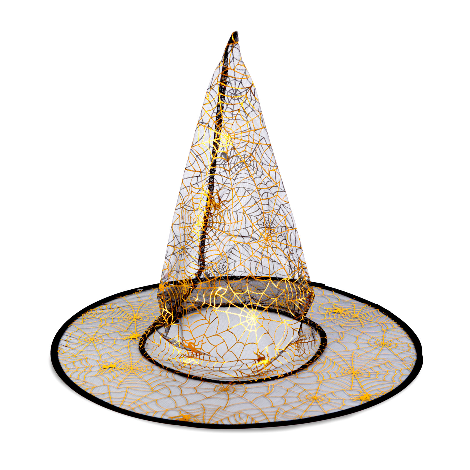 Halloweenský klobouk dostupný ve 4 barvách, který je výborným doplňkem každého halloweenského kostýmu. Vnější stranu klobouku zdobí zlaté třpytivé halloweenské motivy.