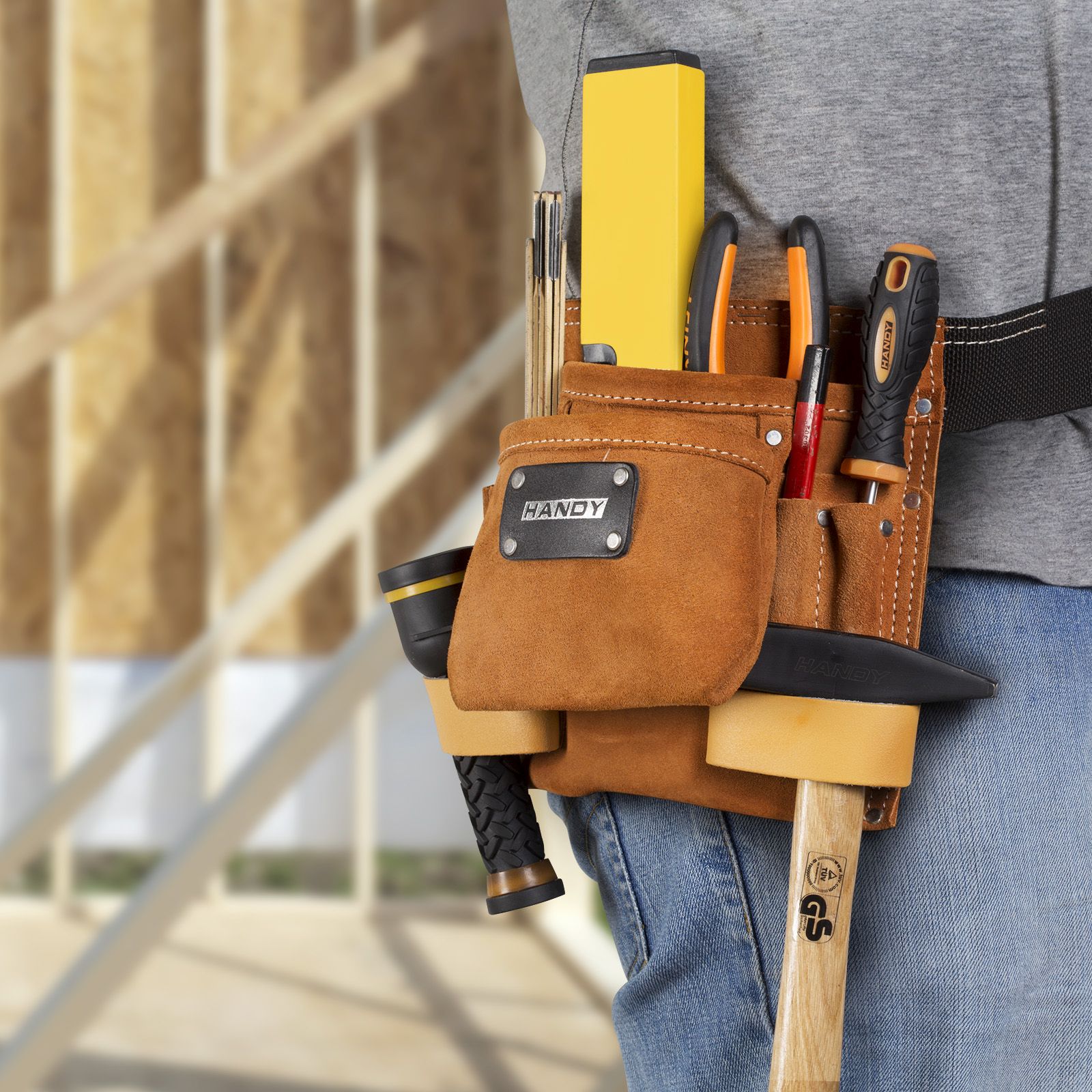 Taška vyrobená z štiepené kůže se 2 velkými kapsami, 2 závěsnými poutky, opaskem a 6 menšími úložnými místy (např. na pera, tužky, šroubováky). Mimořádně odolná, zesílená kovovými nýty, vybavená rychloupínacími přezkami.