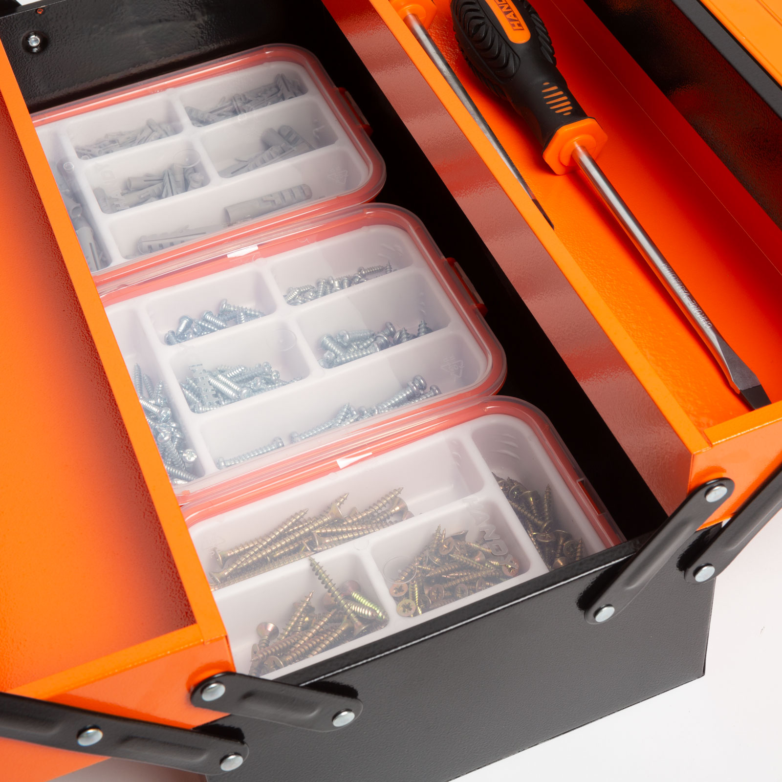 Kufřík na nářadí s klasickým uspořádáním s otevíráním ve stylu harmoniky. Vyrobeno z odolného kovu, takže odolá i intenzivnímu používání. Široké otevření umožňuje snadný přístup k nářadí. Různé nástroje mohou být díky třípolicovému uspořádání uloženy úhledně, přehledně a snadno přístupně.