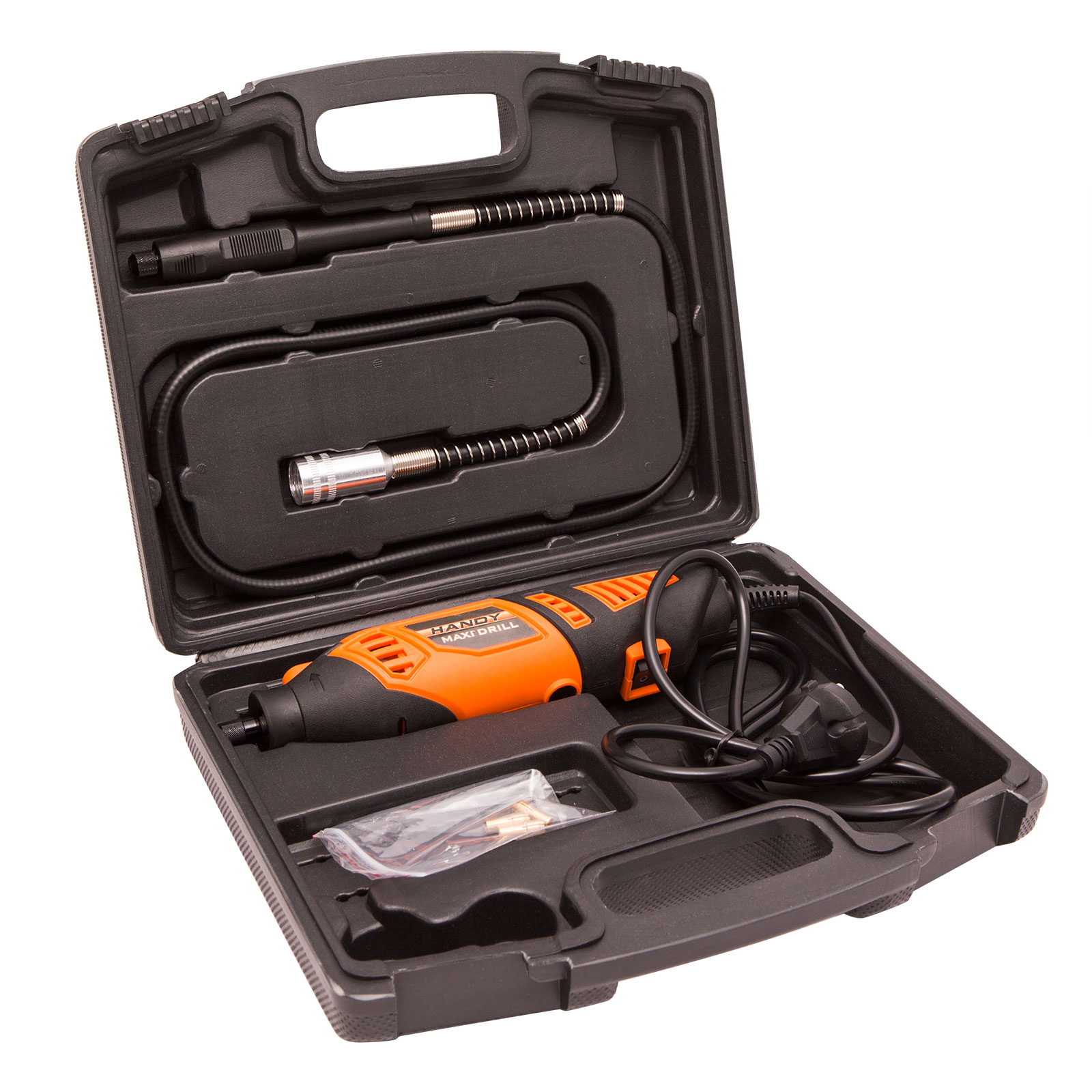 HANDY DRILL modelářská vrtačka je určena především pro broušení, gravírování a vrtací práce v domácnosti, manikúře/pedikúře a pro hobby účely. S pomocí vrtačky můžete vrtat, brousit, leštit, gravírovat, ale také řezat. Maximální upínací rozměr je Ø3,2 mm. Různé příslušenství lze velmi jednoduše upnout.