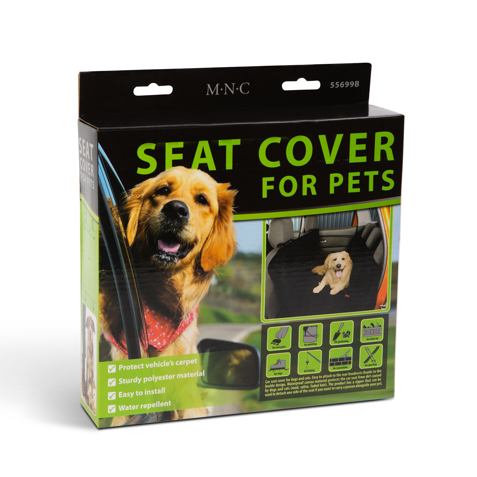 Ochranný potah na sedadlo do auta v první řadě pro psy a kočky. Snadno se připevní na zadní opěrky hlavy díky provedení s karabinou. Voděodolný plátěný materiál ochrání sedadla auta před nečistotami (bláto, sliny, srst..). Může být ideální do aut s malým zavazadlovým prostorem, kde nemůžete přepravovat své domácí zvíře. Produkt disponuje zipem, pomocí kterého můžete jednu část rozepnout, pokud chcete vedle zvířete přepravovat i osobu.
