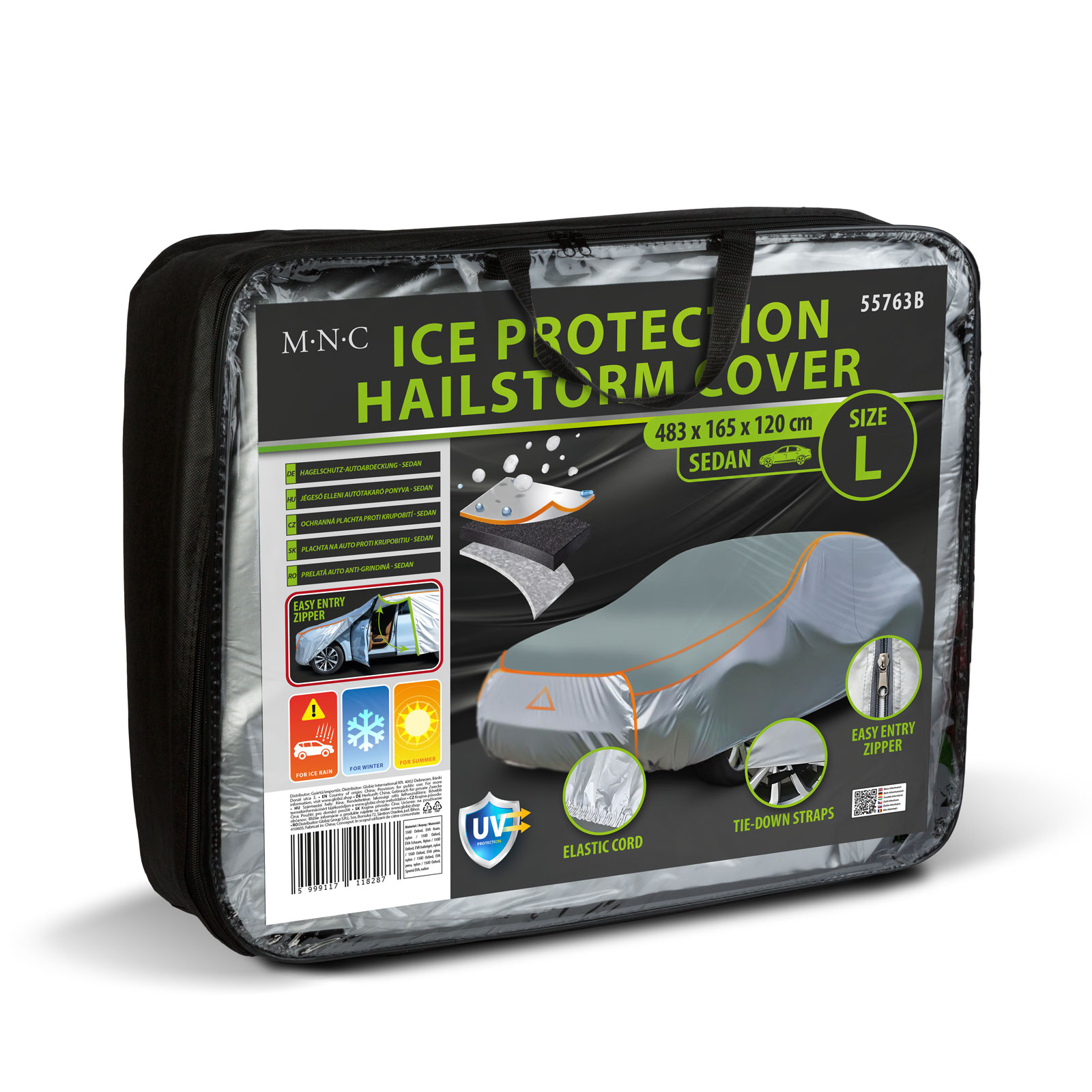 Chraňte své auto před nepříznivým počasím s touto vysoce kvalitní plachtou proti krupobití! Plachta poskytuje úplnou ochranu před krupobitím, UV zářením, deštěm a prachem, čímž dlouhodobě chrání karoserii a lak vašeho vozidla. Kryt je vyroben z tkaniny Oxford 150D a 4 mm silné vrstvy EVA pěny, která účinně tlumí nárazy způsobené ledem a větvemi stromů a zároveň zajišťuje správné větrání. Použitím lze předejít poškození a znečištění karoserie. Vestavěné trojúhelníkové reflexní logo zlepšuje viditelnost a dva upevňovací popruhy zajišťují, že plachta zůstane stabilně na svém místě i při silném větru. Pomocí bočního zipu se můžete snadno dostat do vozidla bez odstranění plachty.