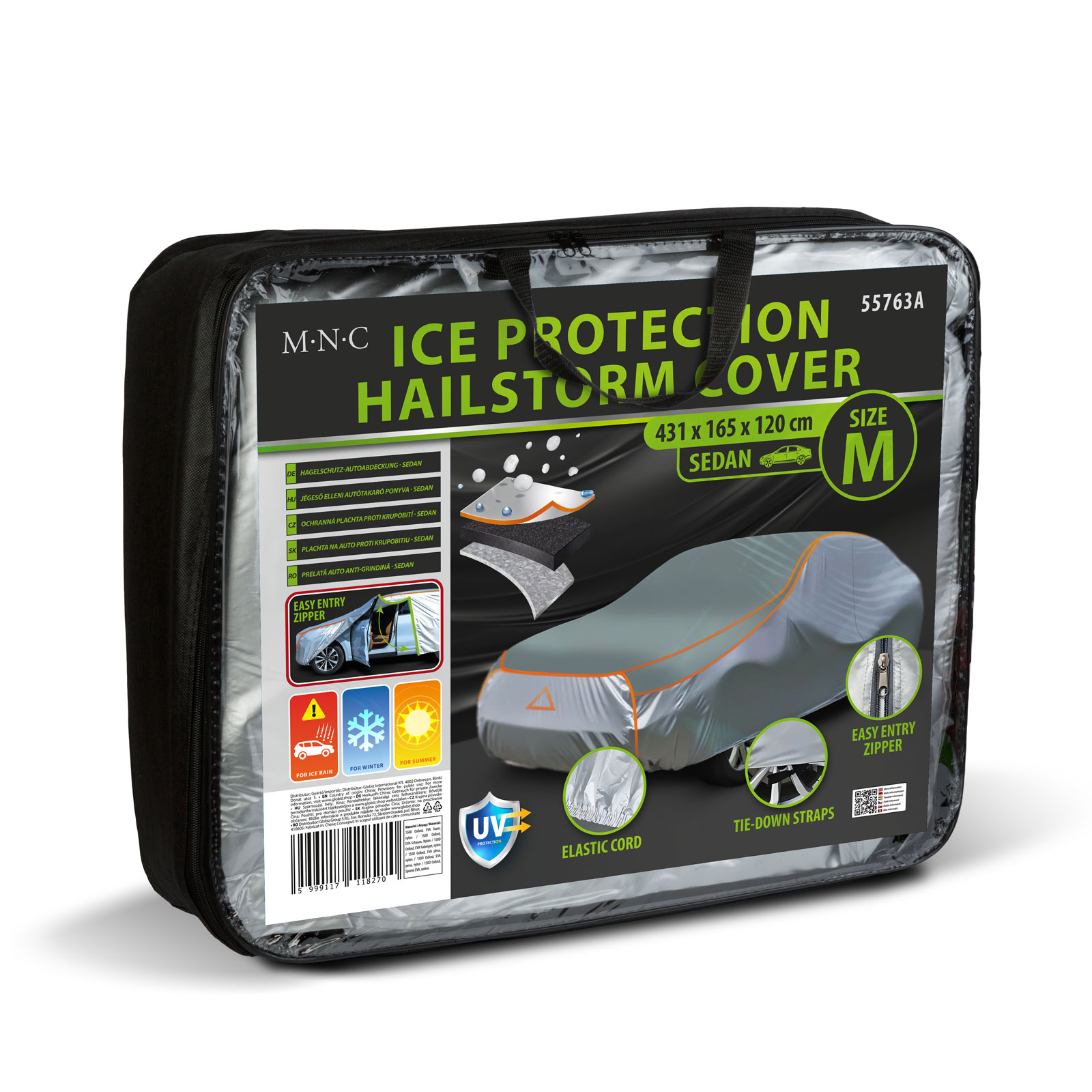 Chraňte své auto před nepříznivým počasím s touto vysoce kvalitní plachtou proti krupobití! Plachta poskytuje úplnou ochranu před krupobitím, UV zářením, deštěm a prachem, čímž dlouhodobě chrání karoserii a lak vašeho vozidla. Kryt je vyroben z tkaniny Oxford 150D a 4 mm silné vrstvy EVA pěny, která účinně tlumí nárazy způsobené ledem a větvemi stromů a zároveň zajišťuje správné větrání. Použitím lze předejít poškození a znečištění karoserie. Vestavěné trojúhelníkové reflexní logo zlepšuje viditelnost a dva upevňovací popruhy zajišťují, že plachta zůstane stabilně na svém místě i při silném větru. Pomocí bočního zipu se můžete snadno dostat do vozidla bez odstranění plachty.