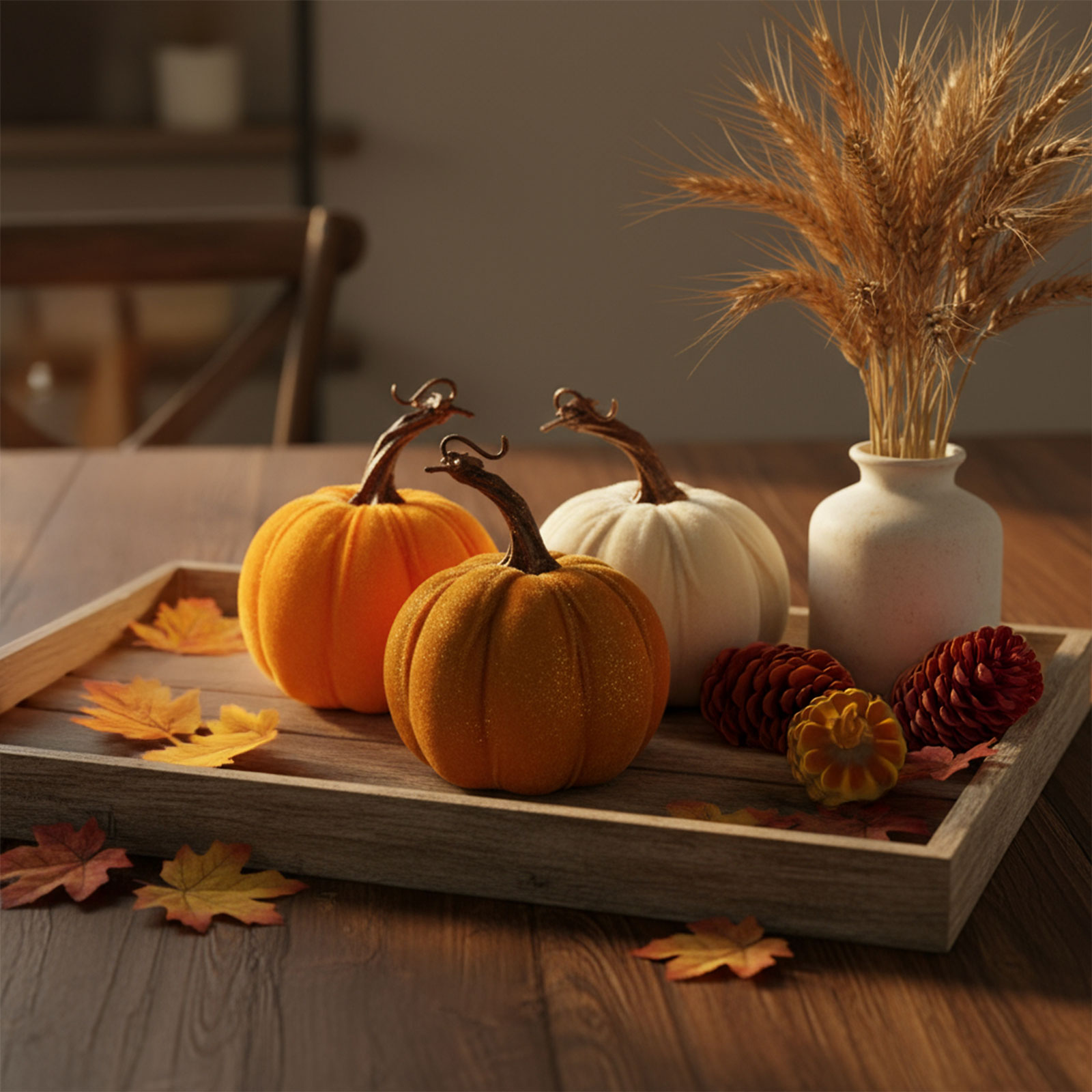 Krásné dekorativní dýně s třpytivým, glitrovým povrchem. Jejich použití závisí jen na vaší fantazii – jsou skvělým dekoračním prvkem pro oživení podzimních, pochmurných dnů. Můžete je zakomponovat do aranžmá nebo použít samostatně jako dekoraci na poličce či stole. Výborná volba také na oslavu Halloweenu.