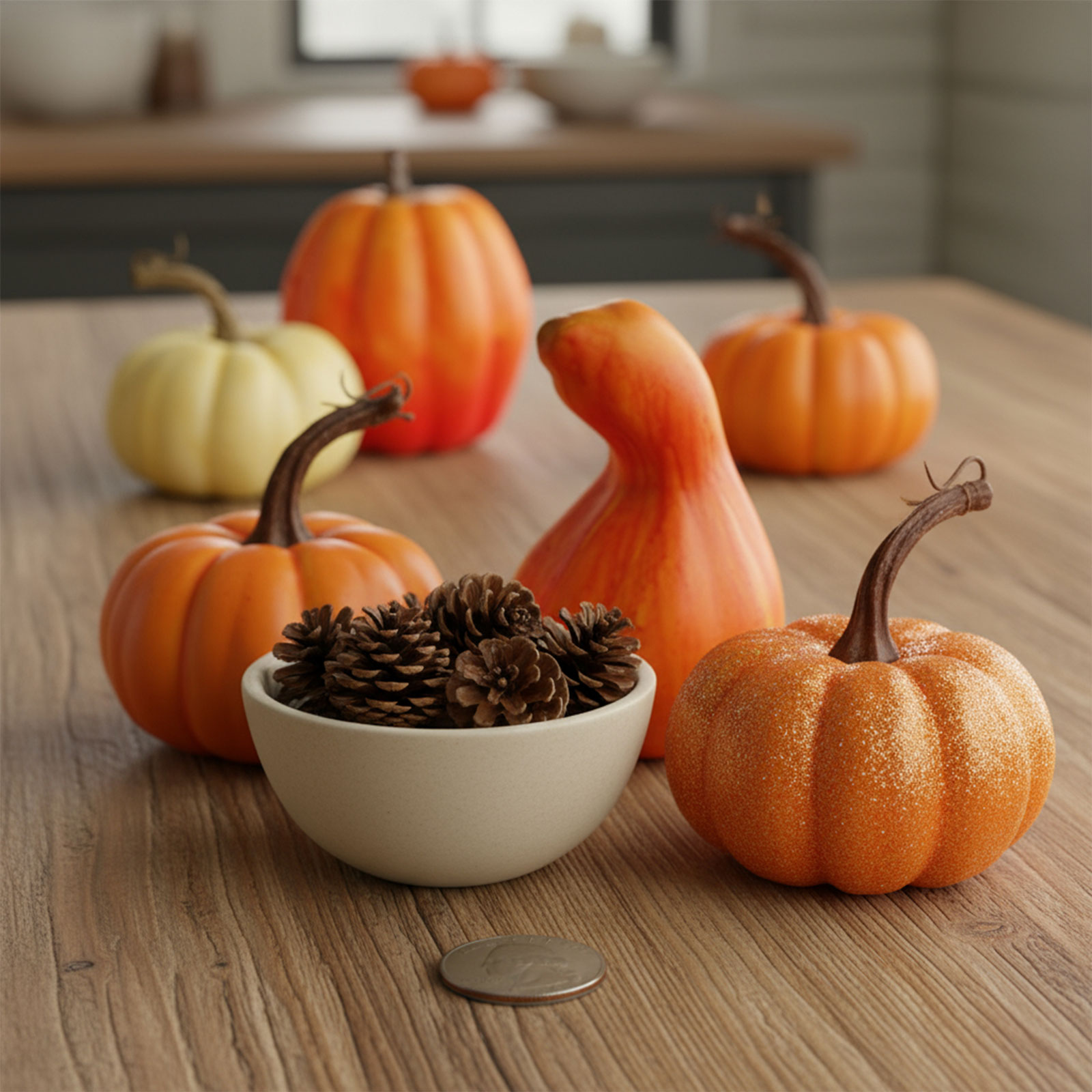 Vneste do svého domova útulnou podzimní atmosféru s těmito dekorativními dýněmi! Šest různých tvarů a barev plastových dýní a kukuřic, které díky svému realistickému vzhledu dokonale doplní jakoukoli podzimní dekoraci. Můžete je použít jako stolní dekoraci, součást věnců nebo pro realizaci kreativních dekoračních nápadů. Díky lehké a odolné konstrukci si zachovají svou krásu po dlouhou dobu.
