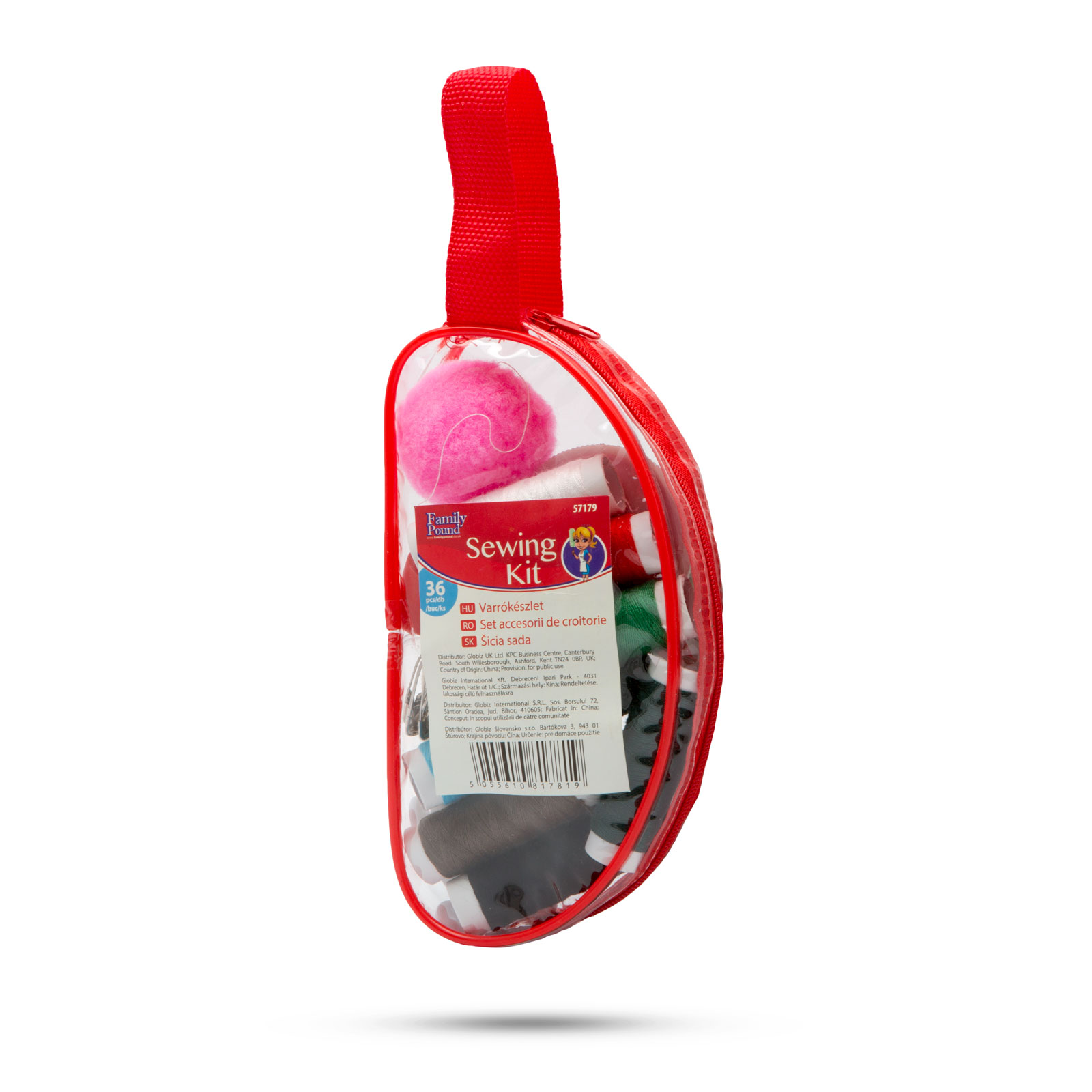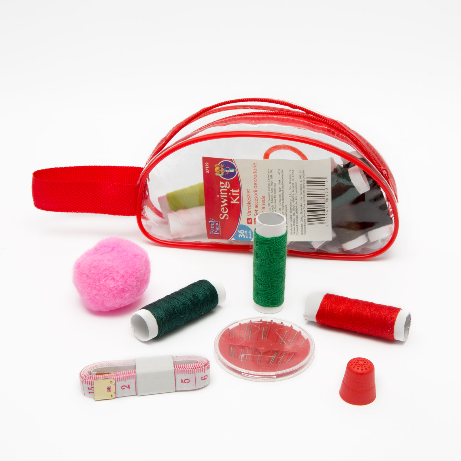 Kompletní sada na šití. Může být užitečným příslušenstvím vaší domácnosti. V taštičce najdete 12 různobarevných nití, cestovní nůžky, 10 zicherek (2,5 cm), 60 cm krejčovský metr, 10 jehel, 4 bílé knoflíky, náprstek a jehelníček.