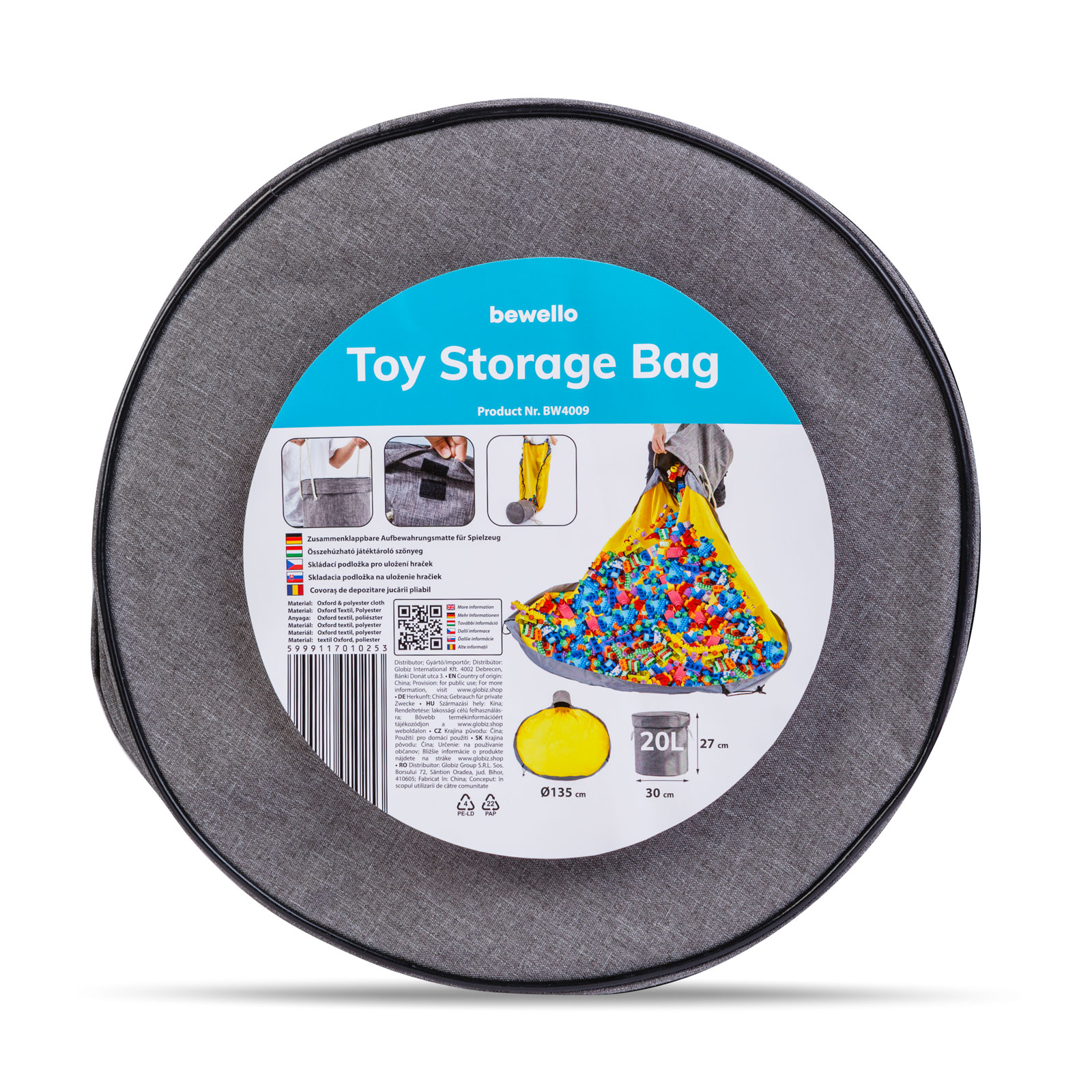Praktický dětský koberec na hraní, který je vhodný pro ukládání různých hraček. Košík má průměr 30 cm, takže hračky můžete snadno vybrat a uložit. Na velký koberec se vejde mnoho hraček. Koberec je vyroben z odolného oxford textilu a polyesteru. Je vhodný pro uložení kostek, malých autíček, panenek nebo jiných hraček.