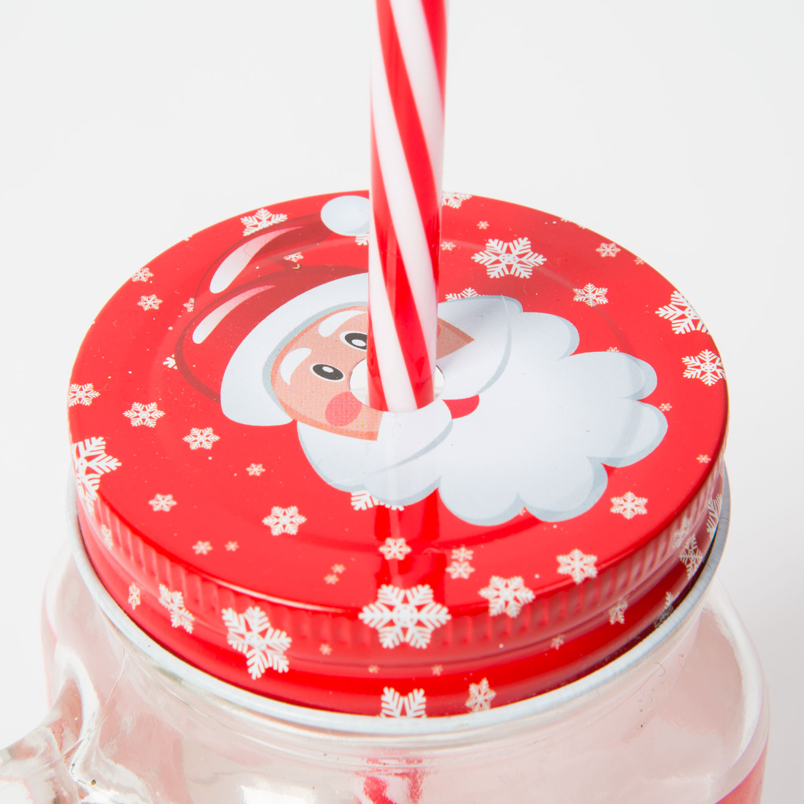 Skleněná sklenice s veselým vánočním motivem: Mikuláš, sněhulák, sob, v různých barvách s kovovým víčkem.