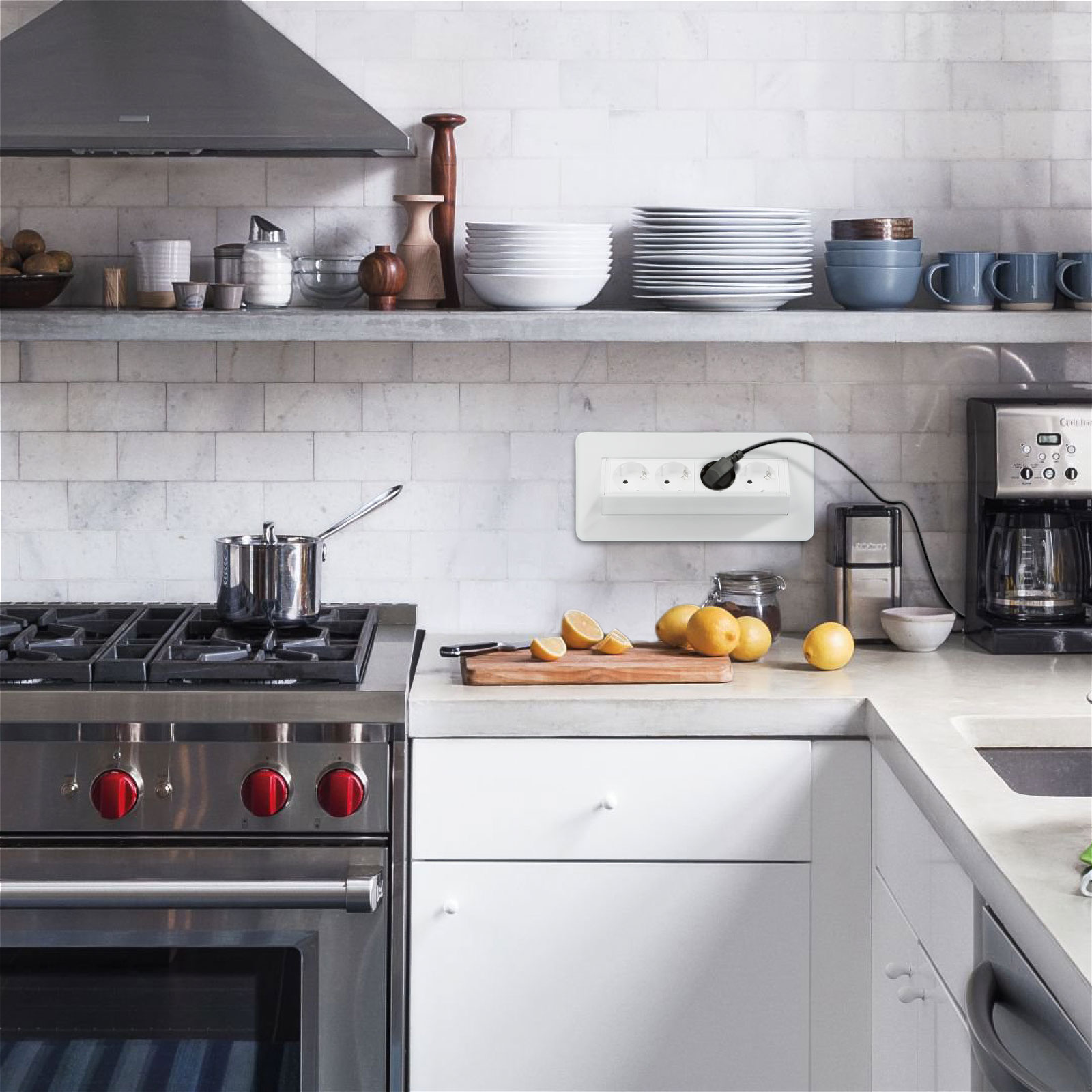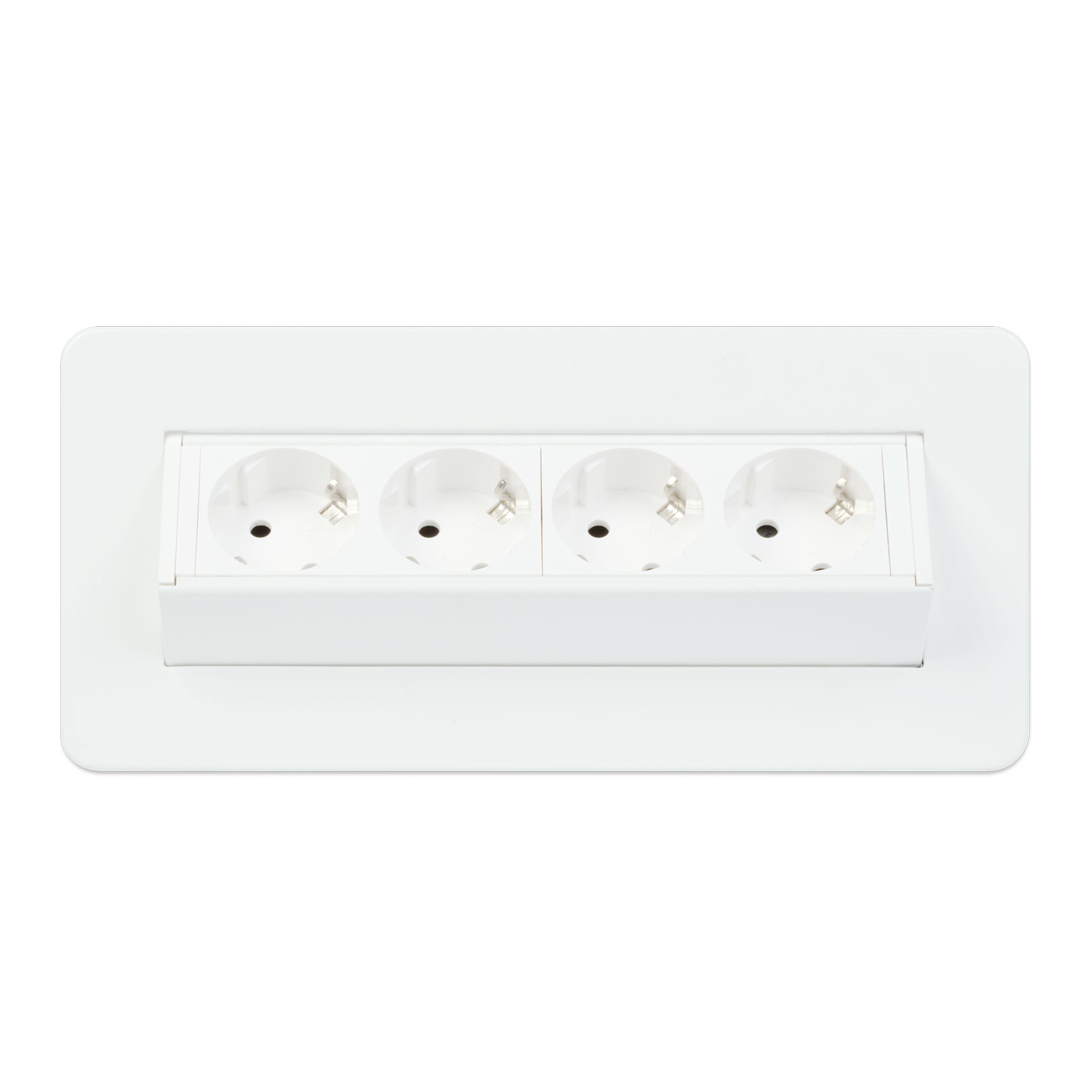 Zásuvka pro zapuštění pro kancelářské a domácí použití s matným bílým povrchem a 4 zásuvkami s dětskou pojistkou. Váš stůl a nábytek budou vždy elegantní a uspořádané, ale zároveň funkční. Skrytá zásuvka je výborným řešením například do již zařízené kuchyně, kde není dostatek zásuvek na požadovaném místě. V takovém případě může být zapuštěná zásuvka skvělou alternativou bez sekání do stěn a rozšiřování elektroinstalace. Jediným pohybem máte k dispozici 4 volné zásuvky. Ideální pro spotřebiče, které nepoužíváme nepřetržitě – toustovač, rychlovarná konvice... Když se nepoužívají, „flip-up“ zásuvku lze jedním pohybem skrýt, což usnadňuje například úklid a zároveň dodává prostoru čistý, upravený vzhled.