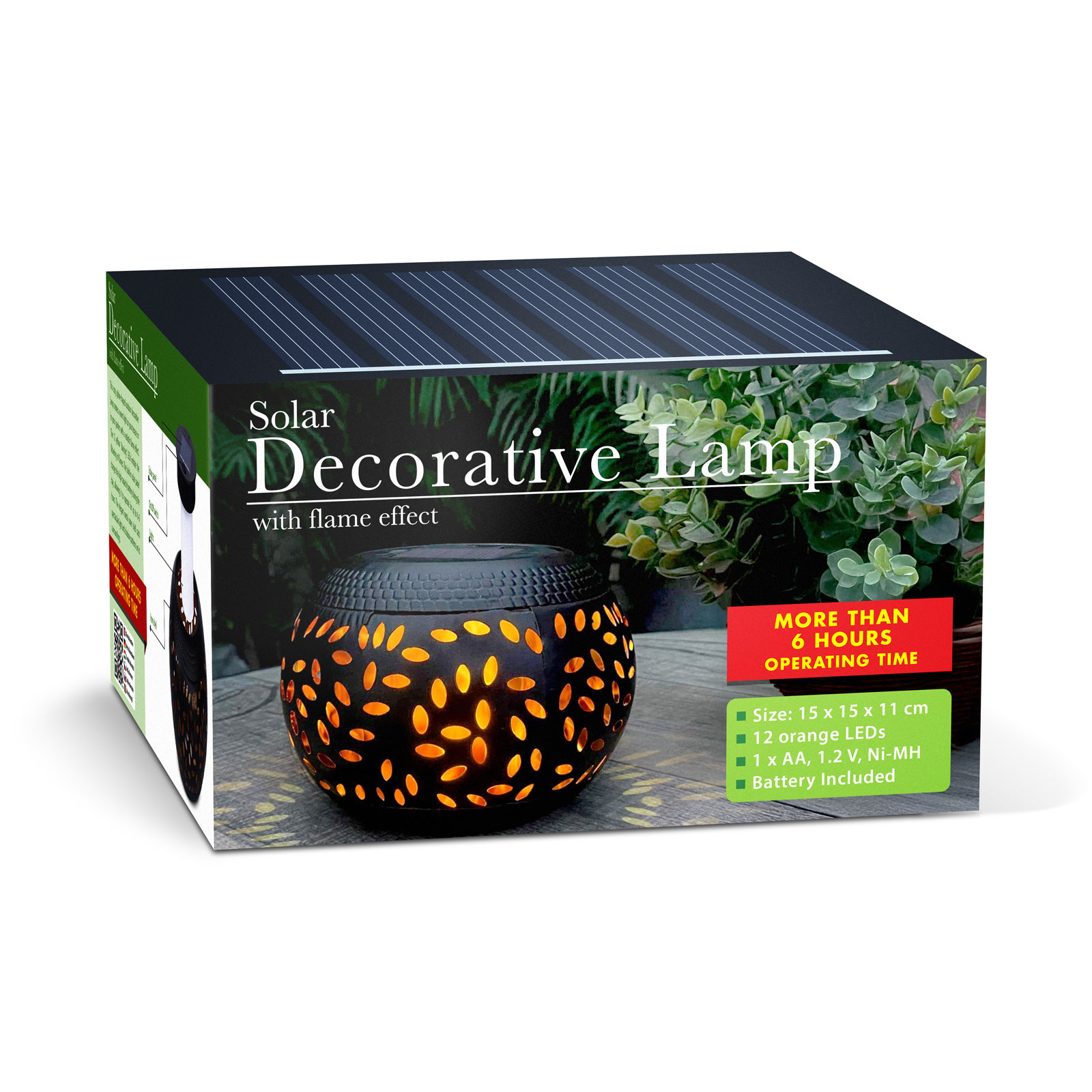 Tato atmosférická, kulová venkovní dekorativní lampa s realistickým efektem plamene vytváří teplé světlo na vaší terase nebo v zahradě. Dvanáct žlutých „tančících“ LED diod imituje mihotání plamene. Vestavěný solární panel 45 × 45 mm během dne nabíjí vysokokapacitní baterii, takže lampa může svítit až 6–8 hodin. Elegantní kovový vnější plášť vytváří působivý vzor světla a stínu v okolí.