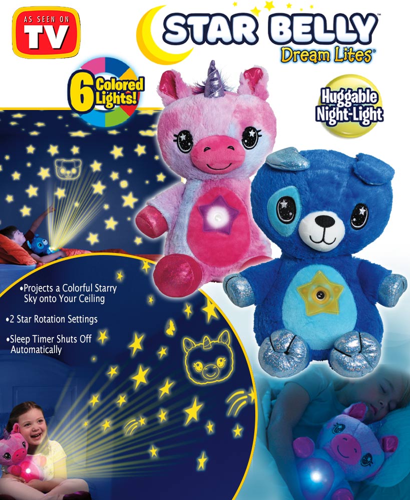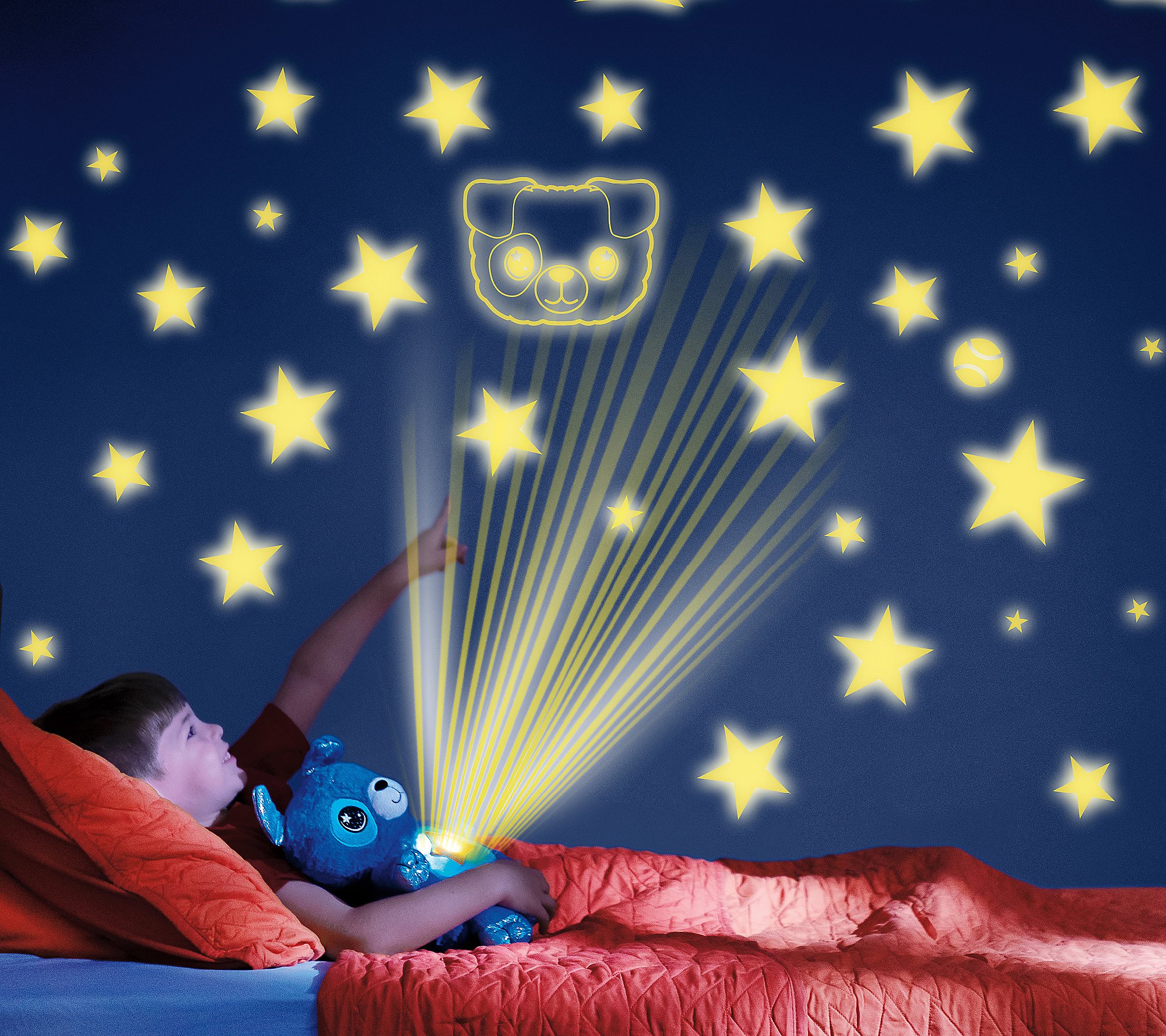 Stisknutím plyšového bříška se projektor zapne a magicky osvětlí strop.