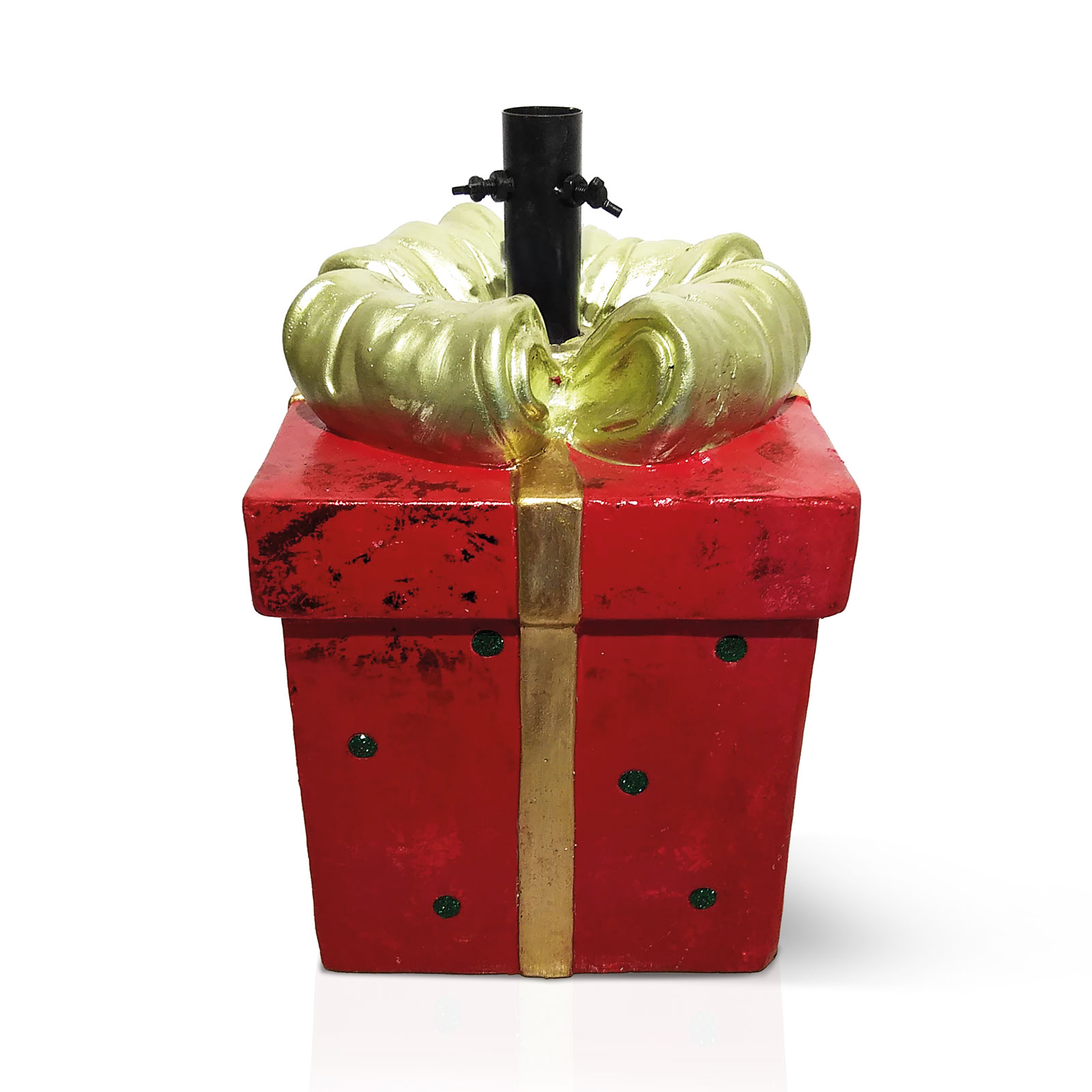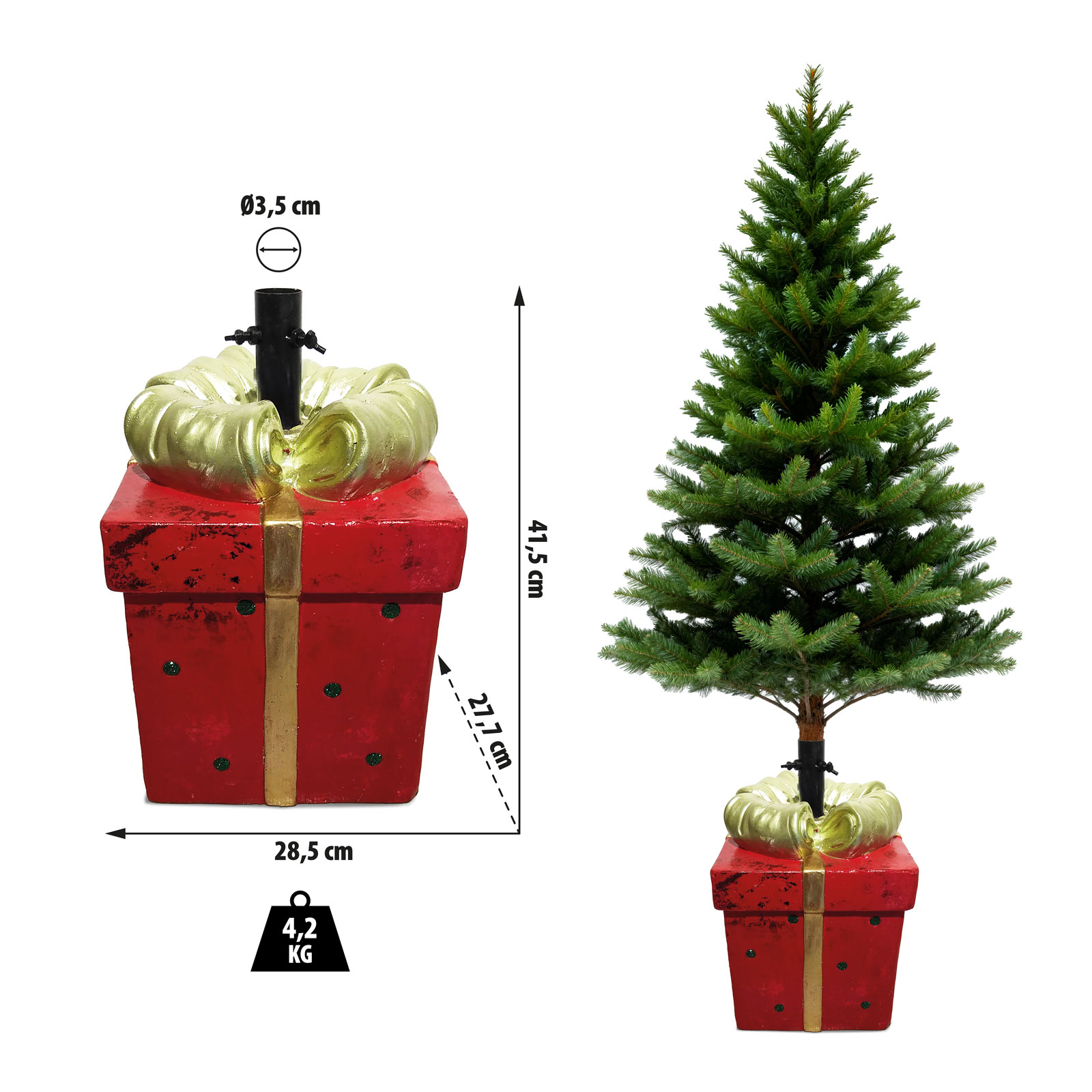 Oživte svůj vánoční stromek tímto stojanem ve tvaru dárkové krabice, který je nejen praktický, ale také dekorativní prvek. Červený design se zlatou mašlí působí jako realistický dárek, zatímco pevně drží stromek. Podstavec z umělého kamene zaručuje stabilitu i u větších stromků.