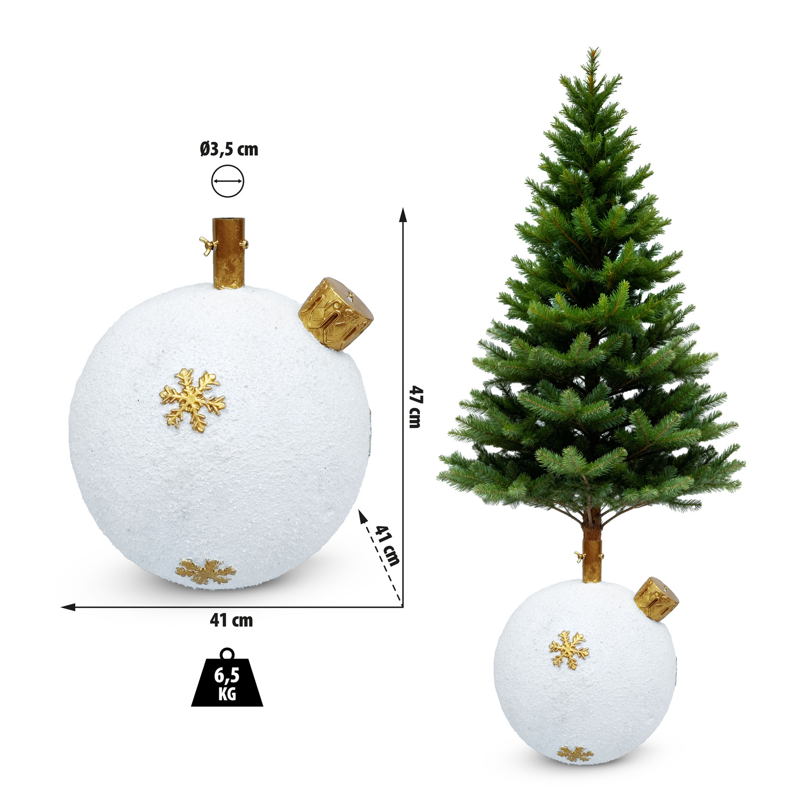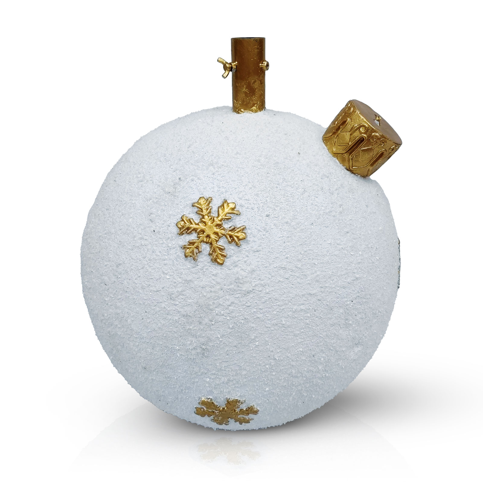 Tento stojan na vánoční stromek ve tvaru vánoční koule není jen praktickou, ale také dekorativní součástí vašeho stromku. Bílá barva s ozdobami ve tvaru zlatých sněhových vloček připomíná skutečnou vánoční ozdobu a zároveň zajišťuje stabilitu stromku. Základna je vyrobena z umělého kamene, který poskytuje pevnou oporu i pro větší stromy.