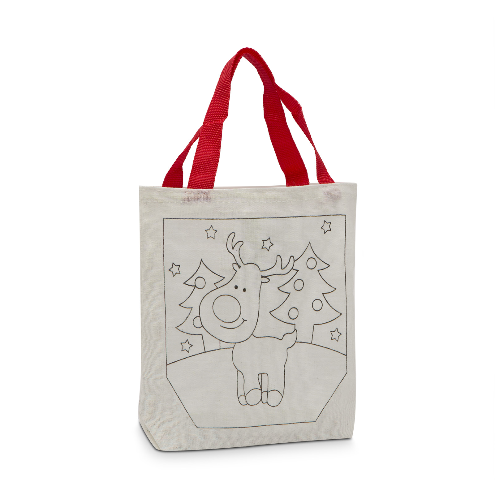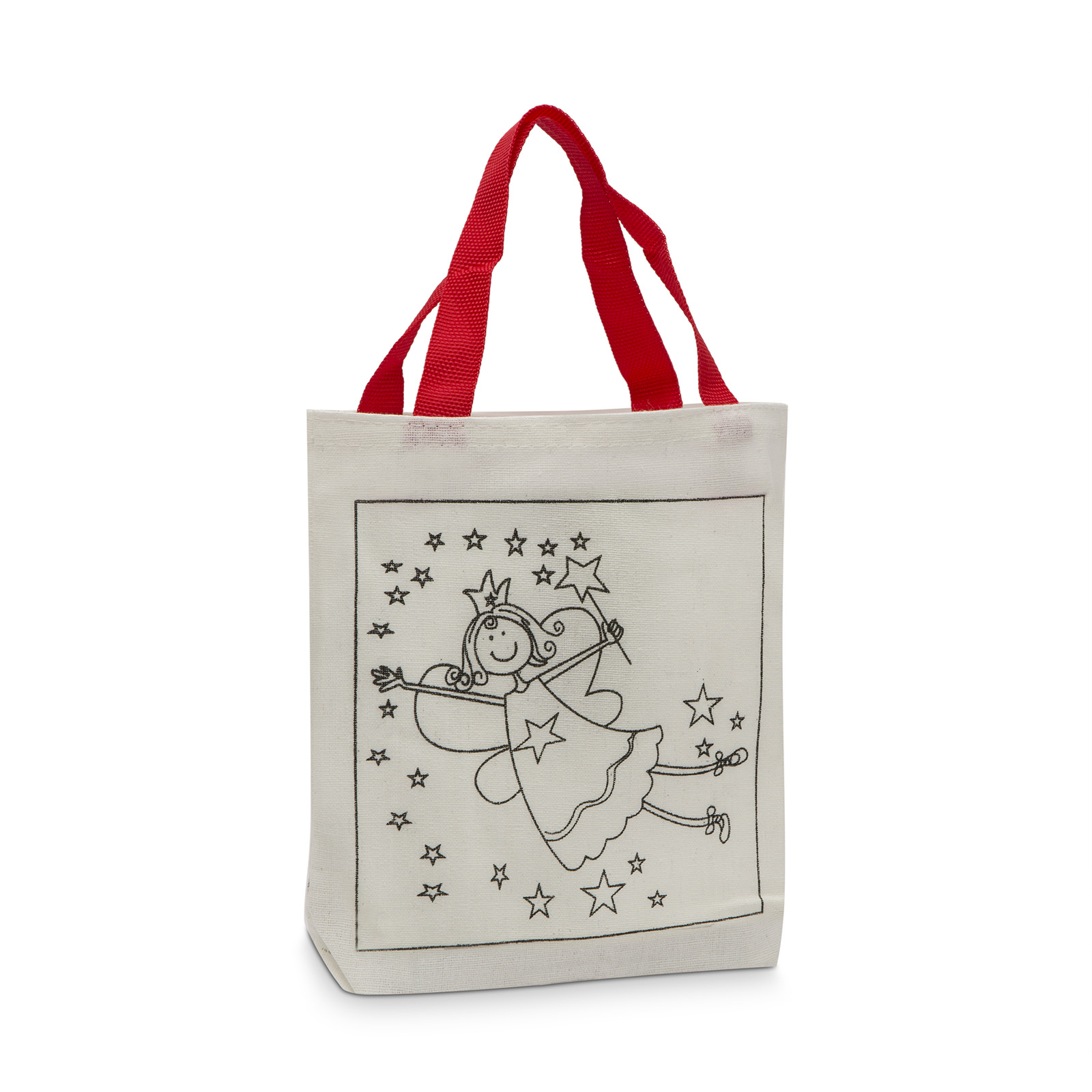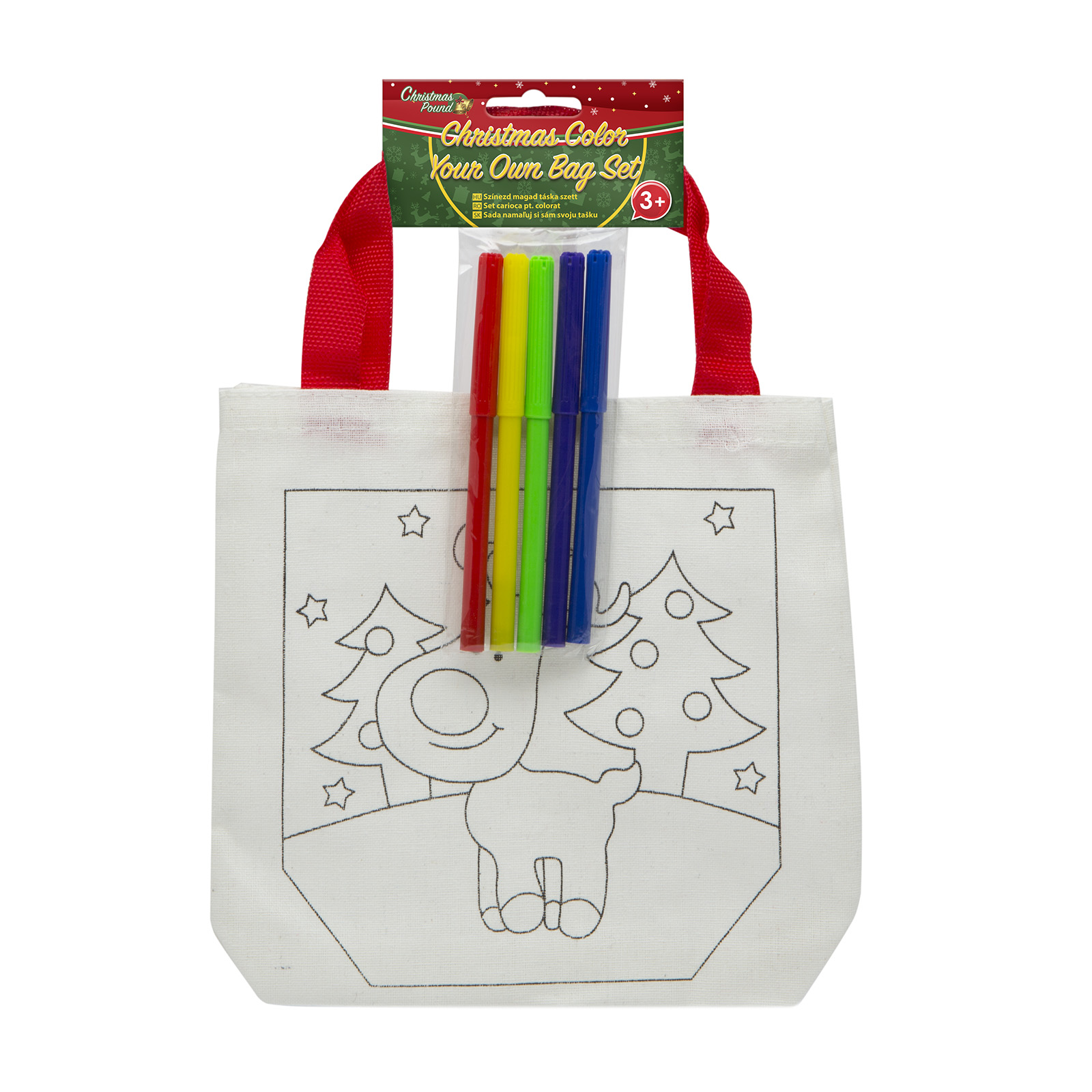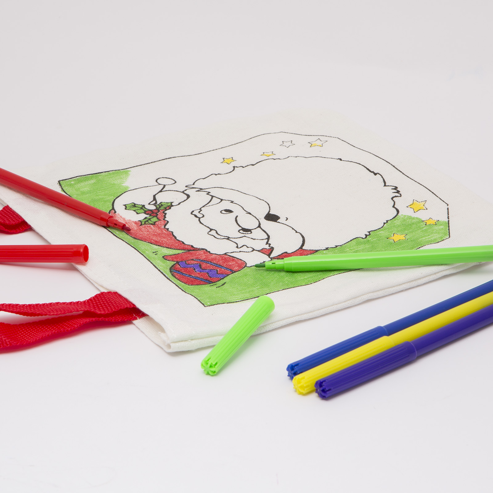 Sada textilní tašky a 5 barevných fixů. Dva dárky v jednom: praktická taška a omalovánka pro děti. Při vybarvování je třeba do tašky vložit silnější papír, aby barvy neprosákly na druhou stranu.