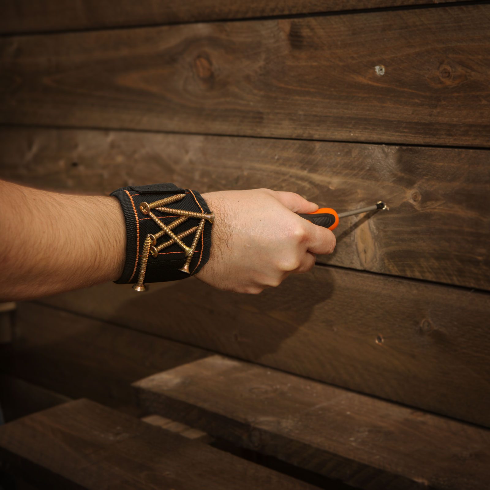 Textilní magnetický náramek, který je pomocníkem při ukládání již odstraněných šroubů, zejména tehdy, pokud nemáte dostatek místa pro uložení šroubů, matic, hřebíků (např. ve výškách, při práci na žebříku).