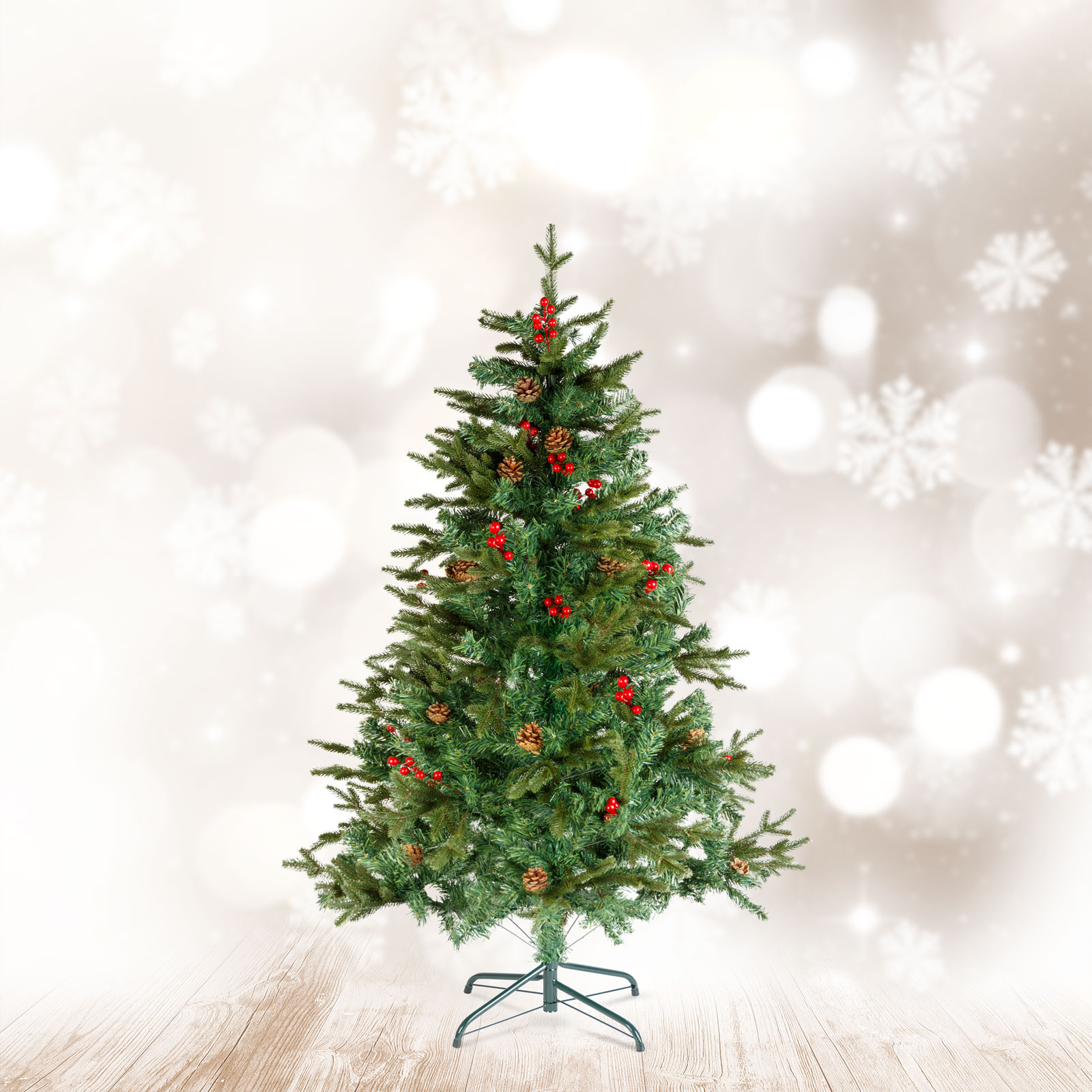 Vytvořte si útulnou sváteční atmosféru ve svém domově s tímto klasickým zeleným umělým stromečkem! Husté větvení, bohaté realistické jehličí a červené bobule vytvářejí přirozený vzhled, což představuje dokonalou alternativu k živému stromku. Umělý stromek vyrobený z odolného materiálu si zachová svou krásu po mnoho let a zároveň neztrácí jehličí.