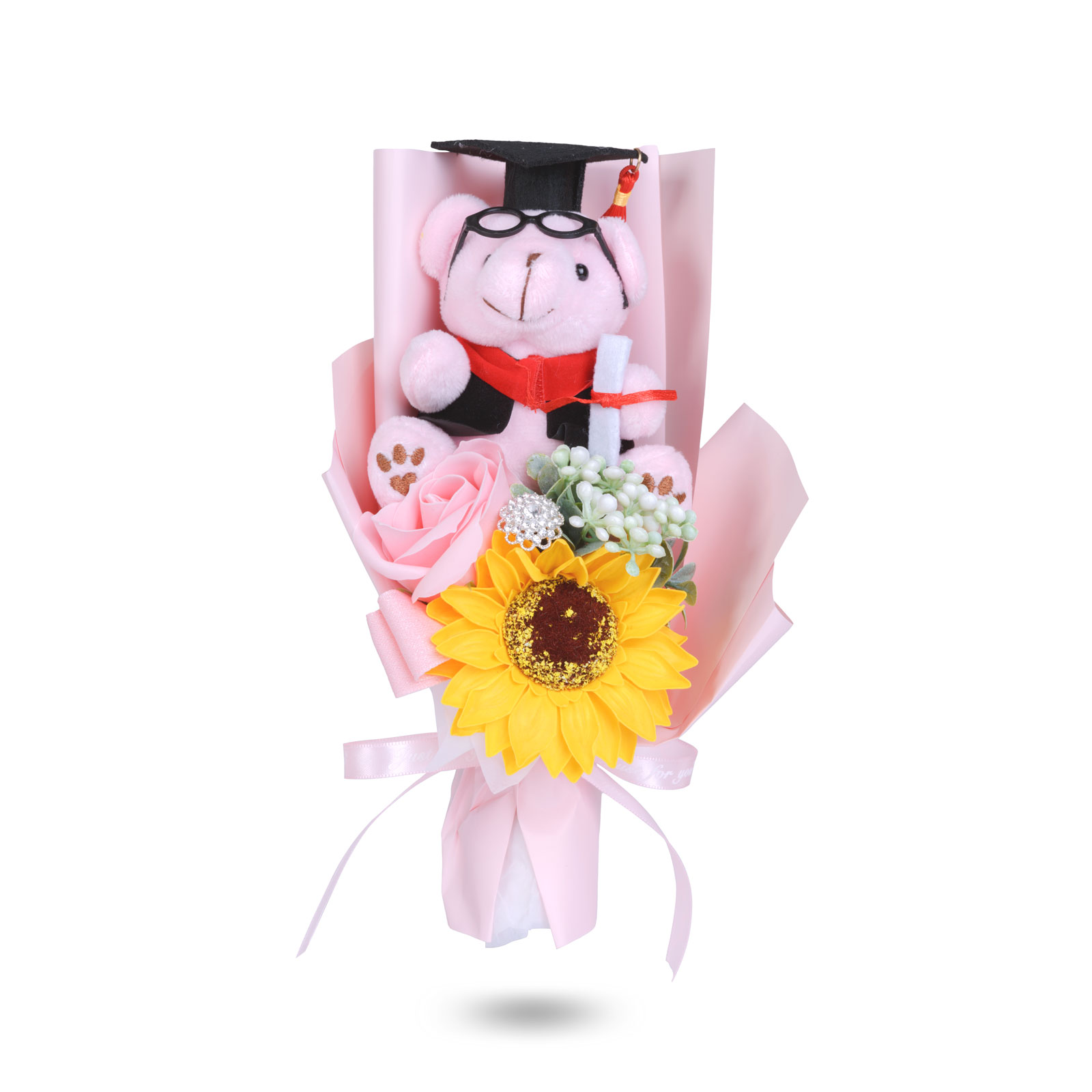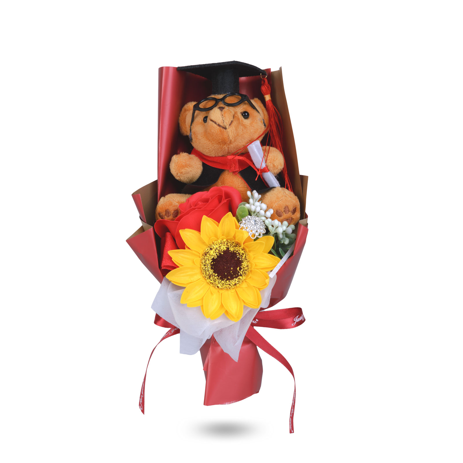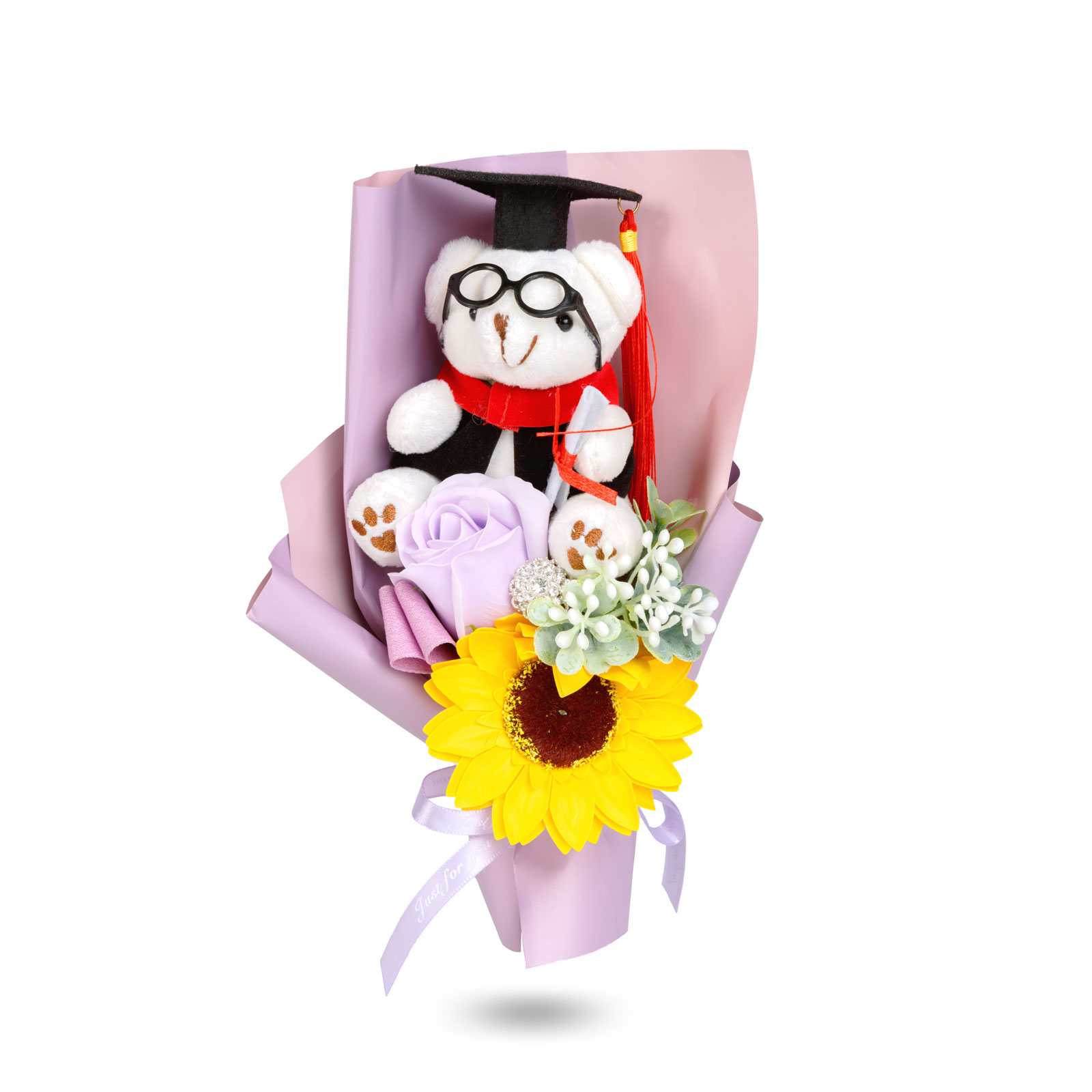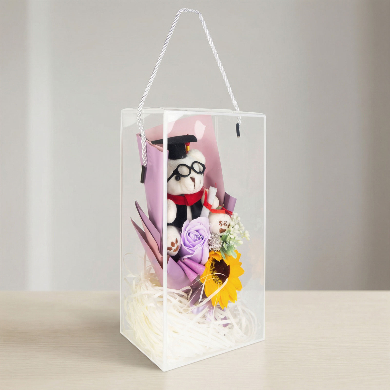 Jedinečný a působivý dárek, který je ideální volbou na rozloučení se školou, promoce nebo jakoukoli slavnostní příležitost. Dekorace umístěná v průhledné dárkové krabičce obsahuje roztomilého promočního medvídka, realistickou slunečnici a elegantní ozdobné prvky, takže ji lze ihned darovat bez nutnosti dalšího balení. Harmonicky sladěné barvy a detailní zpracování ji činí skutečně výjimečnou.