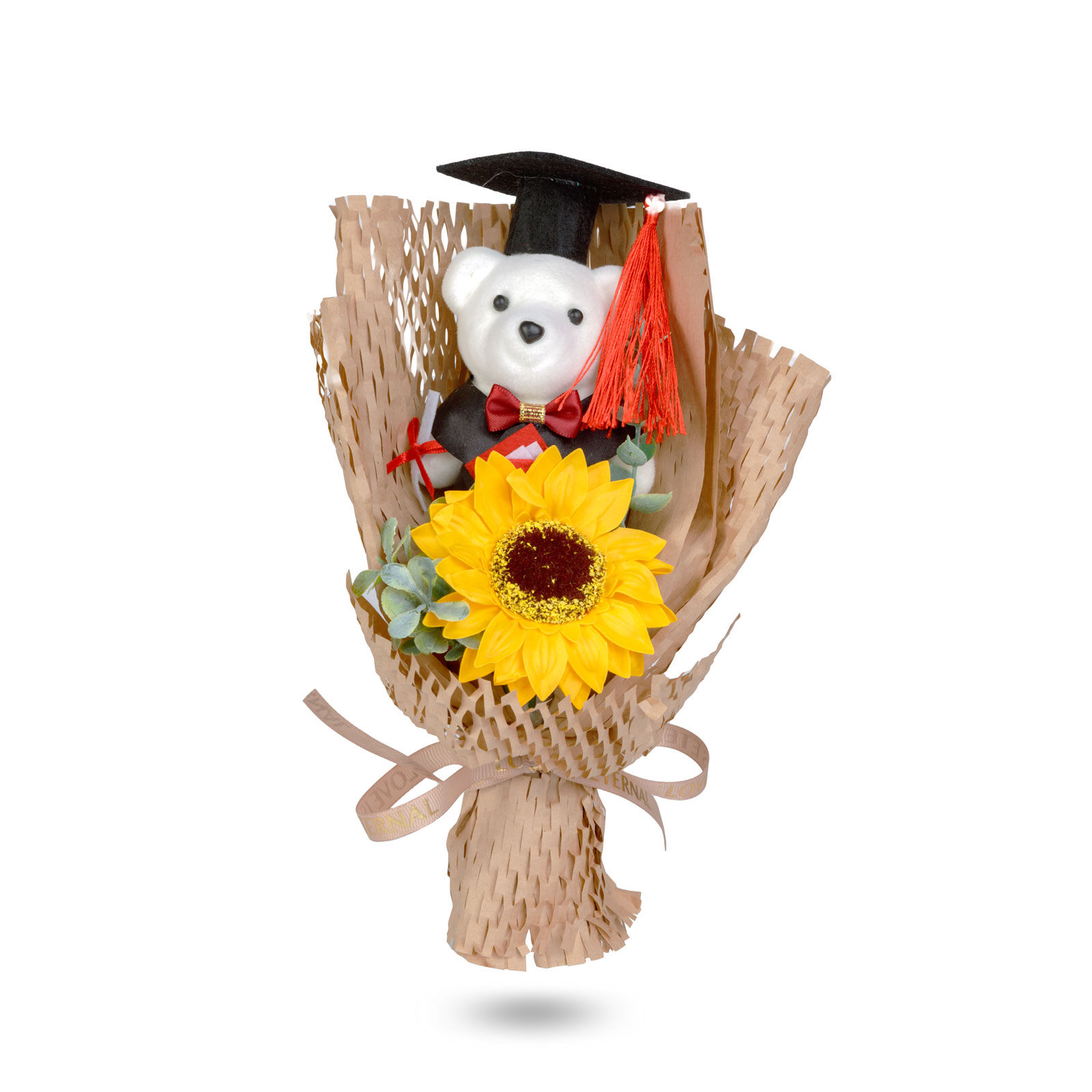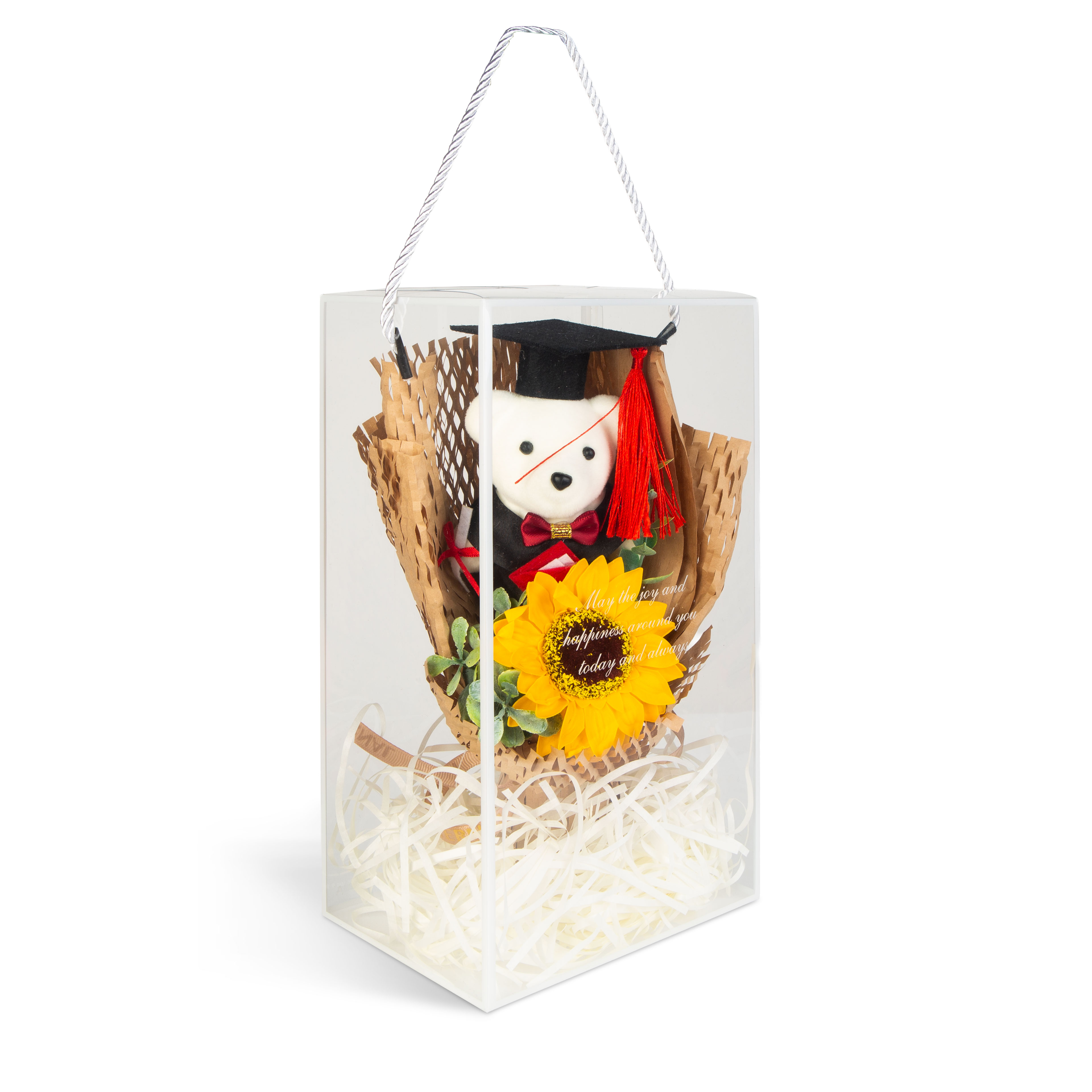 Jedinečná dekorace připravená k okamžitému darování, která je ideální volbou na rozloučení se školou, promoce nebo jakoukoli slavnostní příležitost. Kompozice umístěná v průhledné dárkové krabičce obsahuje roztomilého „promočného“ medvídka, realistickou slunečnici a vkusné dekorační prvky, takže nevyžaduje další balení. Harmonicky sladěné detaily a precizní zpracování z ní dělají skutečně působivý dárek.