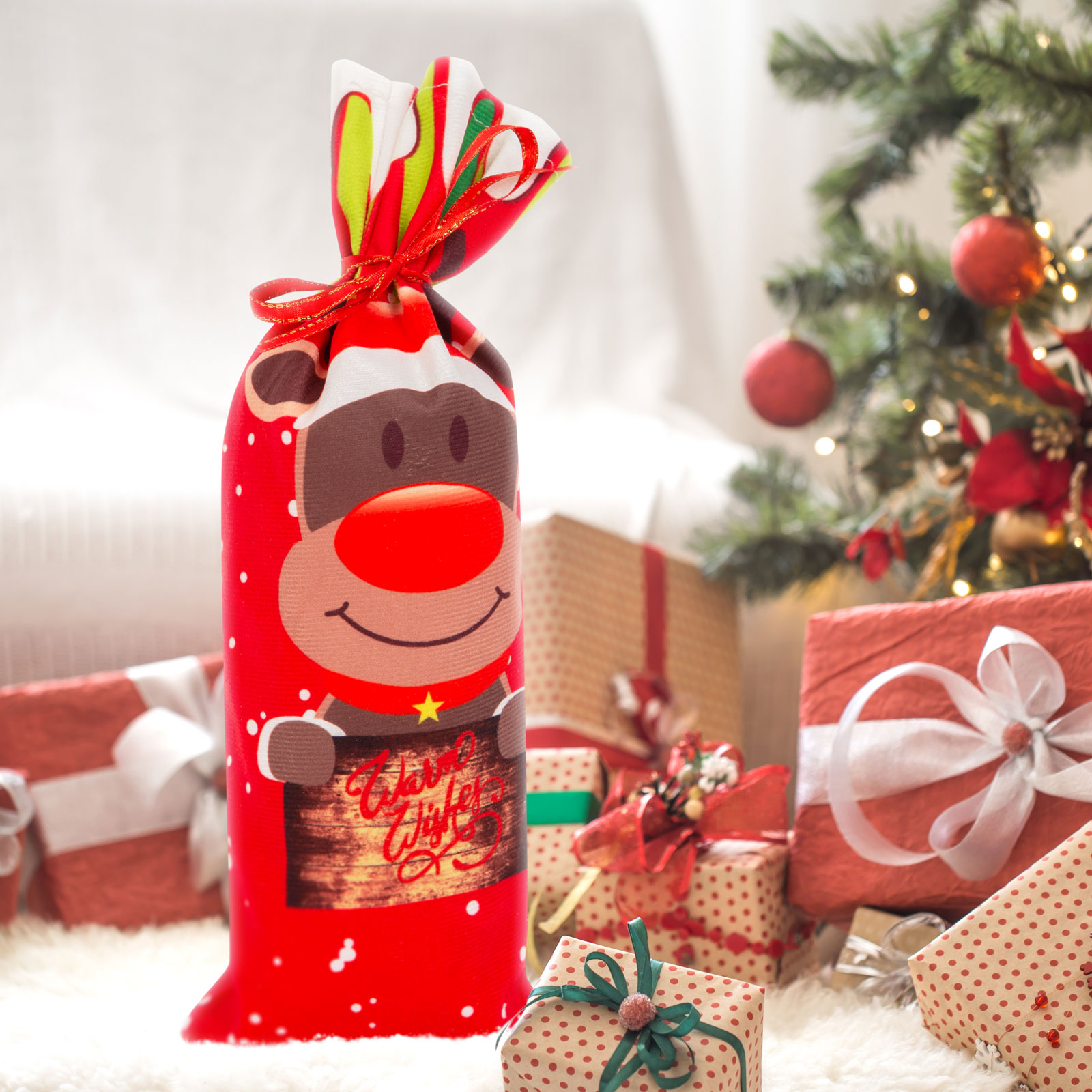 Darujte stylově o Vánocích, oblečte své dárky. Láhve vložte do této polyesterové tašky a uvažte mašli ze stuhy na hrdlo láhve.