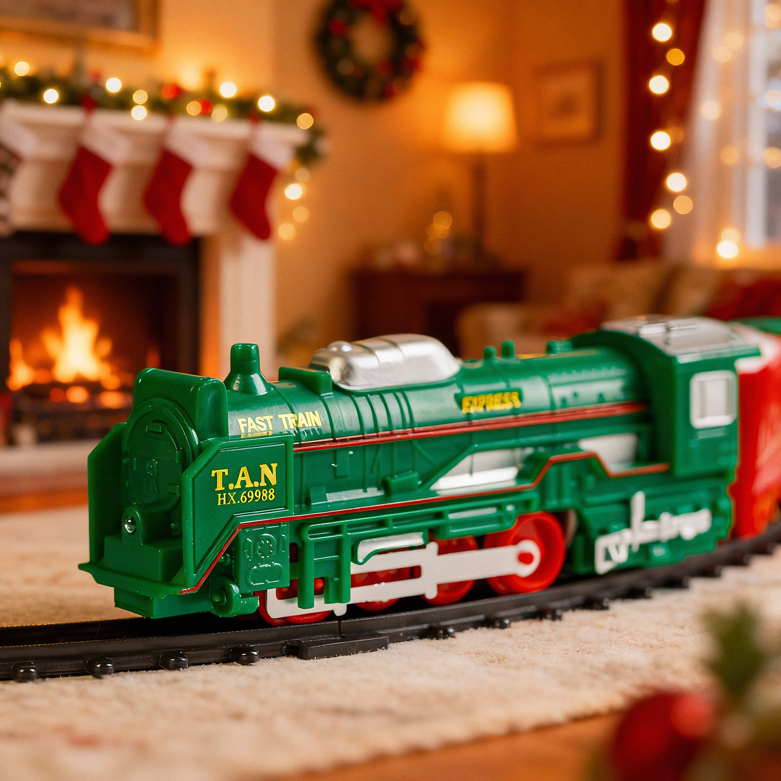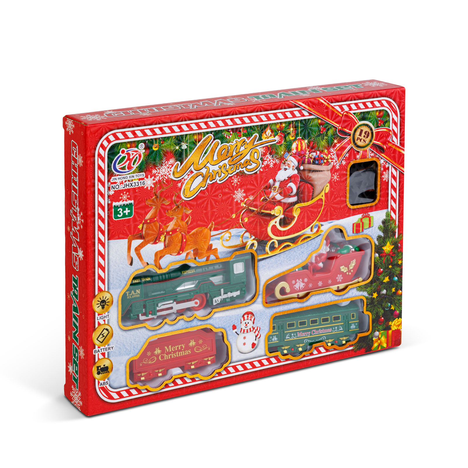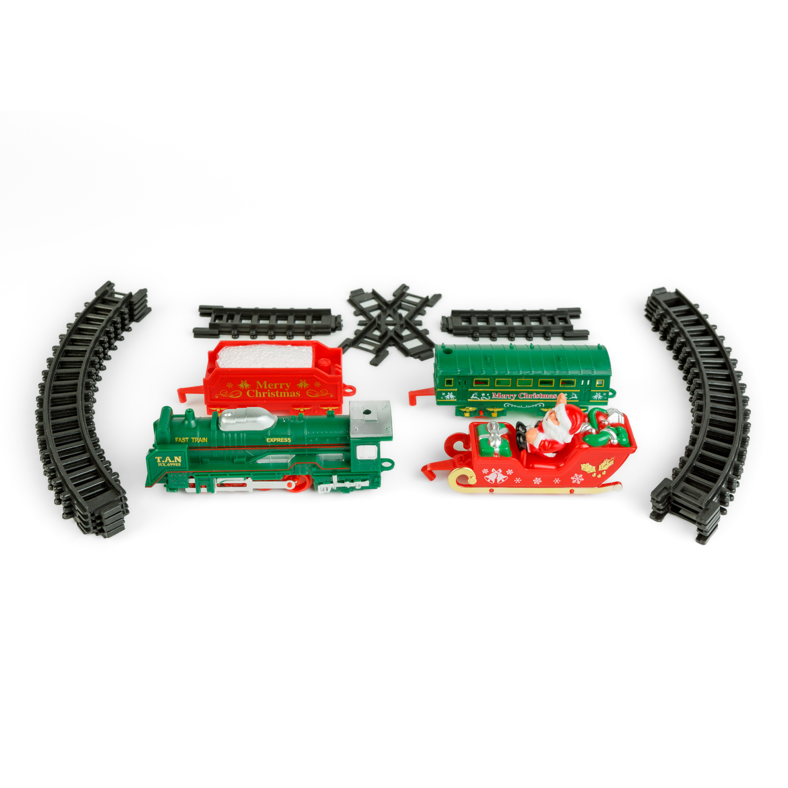 Obsah balenia: | 1 lokomotiva – 13 cm 1 sáně s Mikulášem – 9,5 cm 1 červený vagón – 8 cm 1 zelený vagón – 10 cm 15 ks kolejnic (10 ks obloukových, 4 ks krátkých rovných, 1 ks křižovatka) |