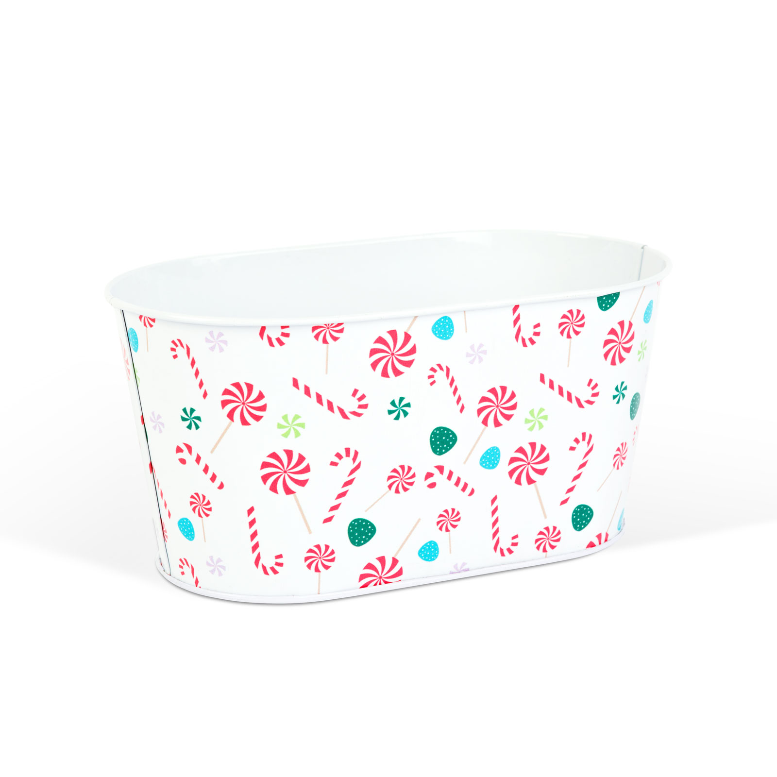Tento veselý vánoční kovový košík se vzorem lízátek je ideální volbou pro sváteční období! Můžete jej využít k uložení cukroví, drobných dárků, sladkostí nebo dekorací. Pevný kovový materiál zaručuje odolnost a barevný vzor vytváří sváteční atmosféru. Skvěle vypadá na stole, polici či komodě – jednoduše kdekoliv!