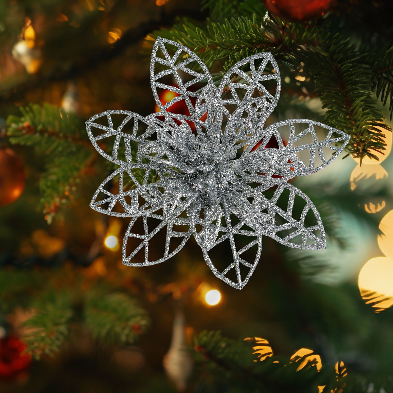 Speciální produkt na vánoční dekoraci, který lze upevnit pomocí klipu. Květ má lesklý, třpytivý povrch. Díky klipovému uchycení má široké využití a je ideální také pro zdobení vánočních stromků, girland, klop a adventních věnců.