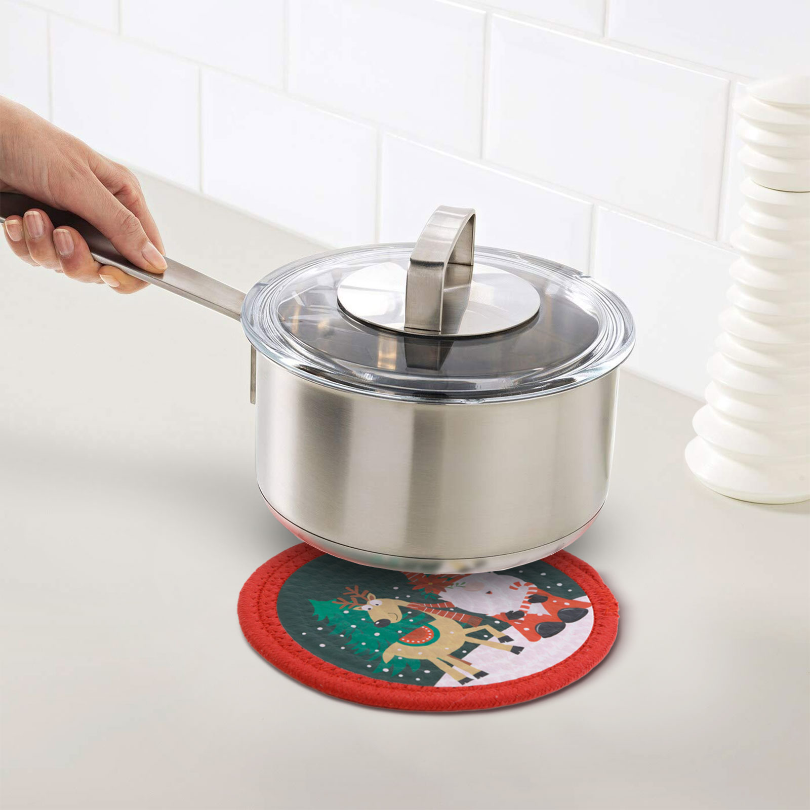 Vánoční podložka na stůl vyrobená z textilu, která zabrání poškození vašeho stolu a pultu horkým nádobím. Podložka se hodí do výzdoby slavnostního stolu, takže harmonie může být úplná.