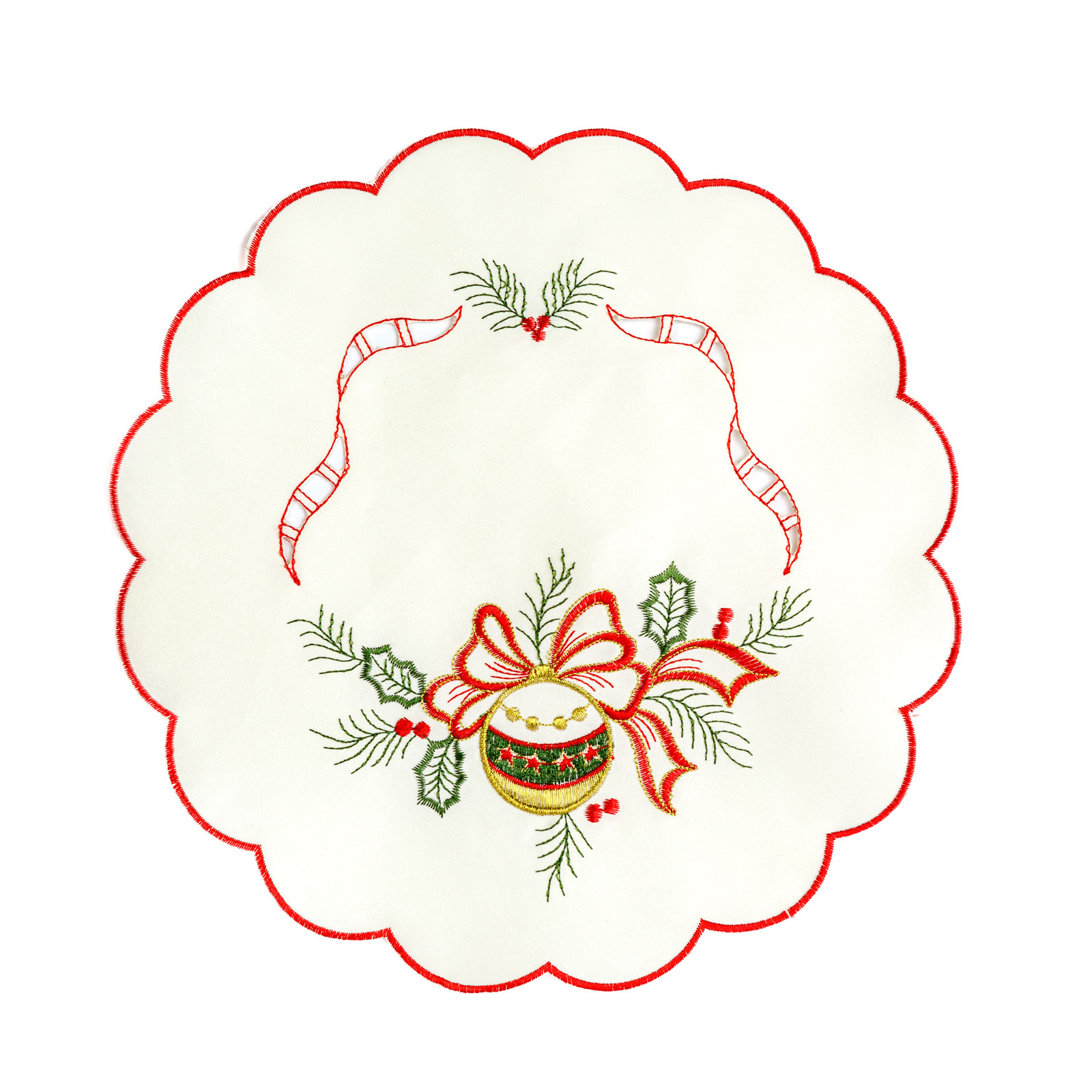 Tento klasický vyšívaný vánoční ubrus je dokonalou volbou pro vytvoření sváteční atmosféry. Kulatý tvar, červený lem a detailně vyšívané vzory – zvoneček, svíčka, vánoční koule a jmelí – dodávají každému stolu elegantní vzhled. Ubrus o průměru 29 cm je ideální na stoly, komody nebo pod dekorativní mísy.