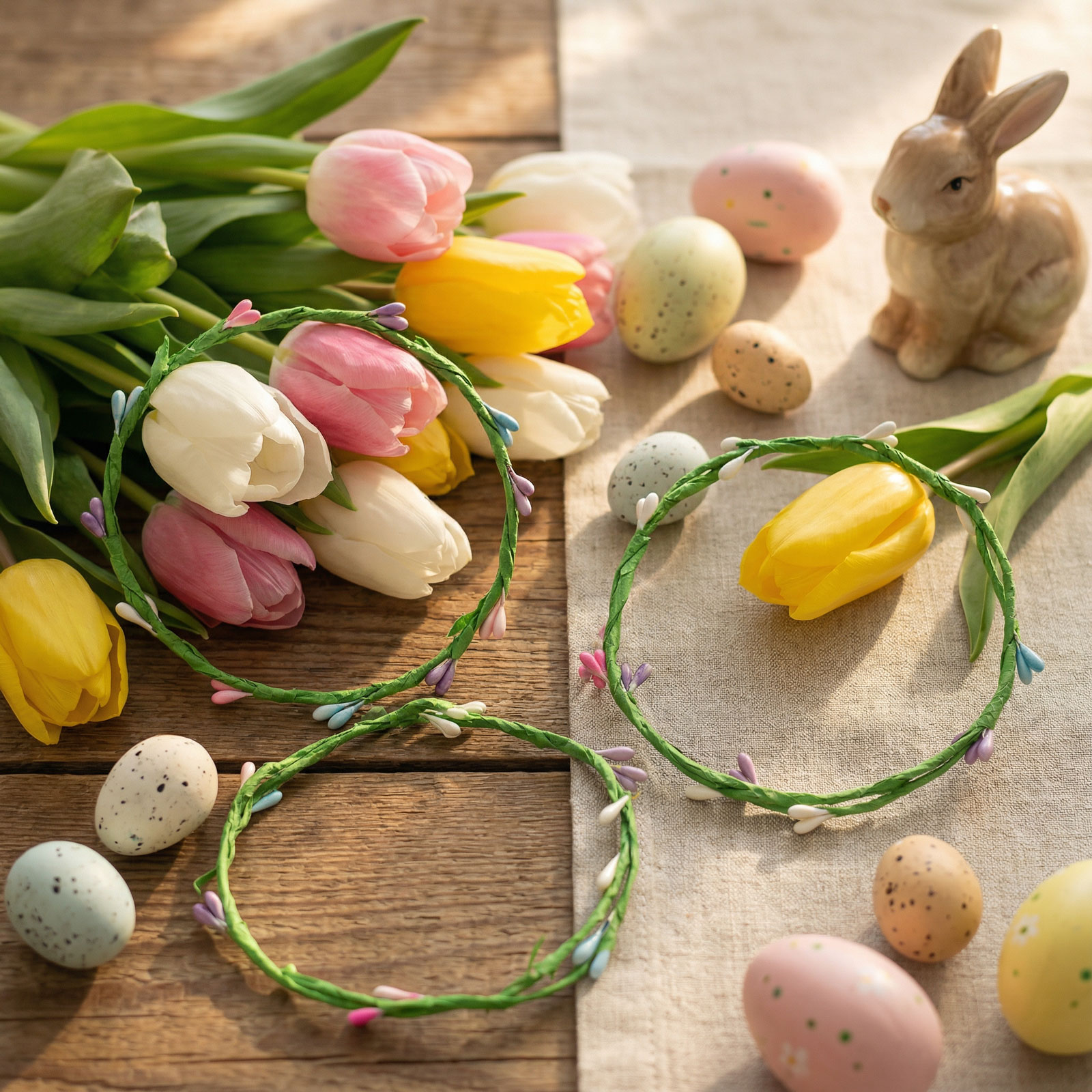 Rozzařte svůj domov tímto veselým, barevným velikonočním věncem! Dekorativní věnec je ozdobený malými pastelovými poupátky, které dodávají každé místnosti svěží a jarní atmosféru. Ideální k zavěšení na dveře, okna, stěny nebo jako stolní dekorace. Vyrobený z odolného materiálu, takže jej můžete používat rok co rok. V balení najdete 4 věnce, kterými můžete ozdobit více místností, kompozic nebo dárků.