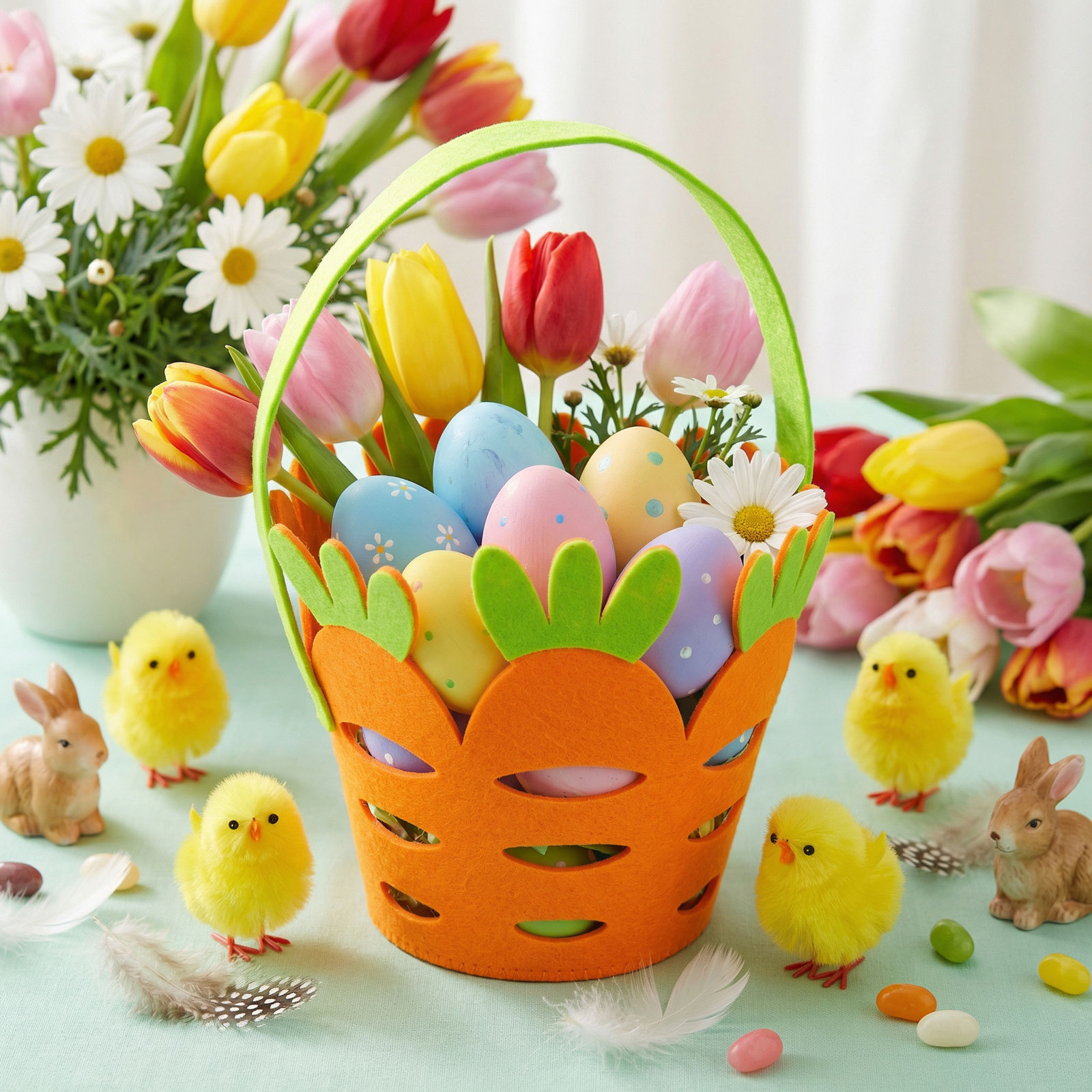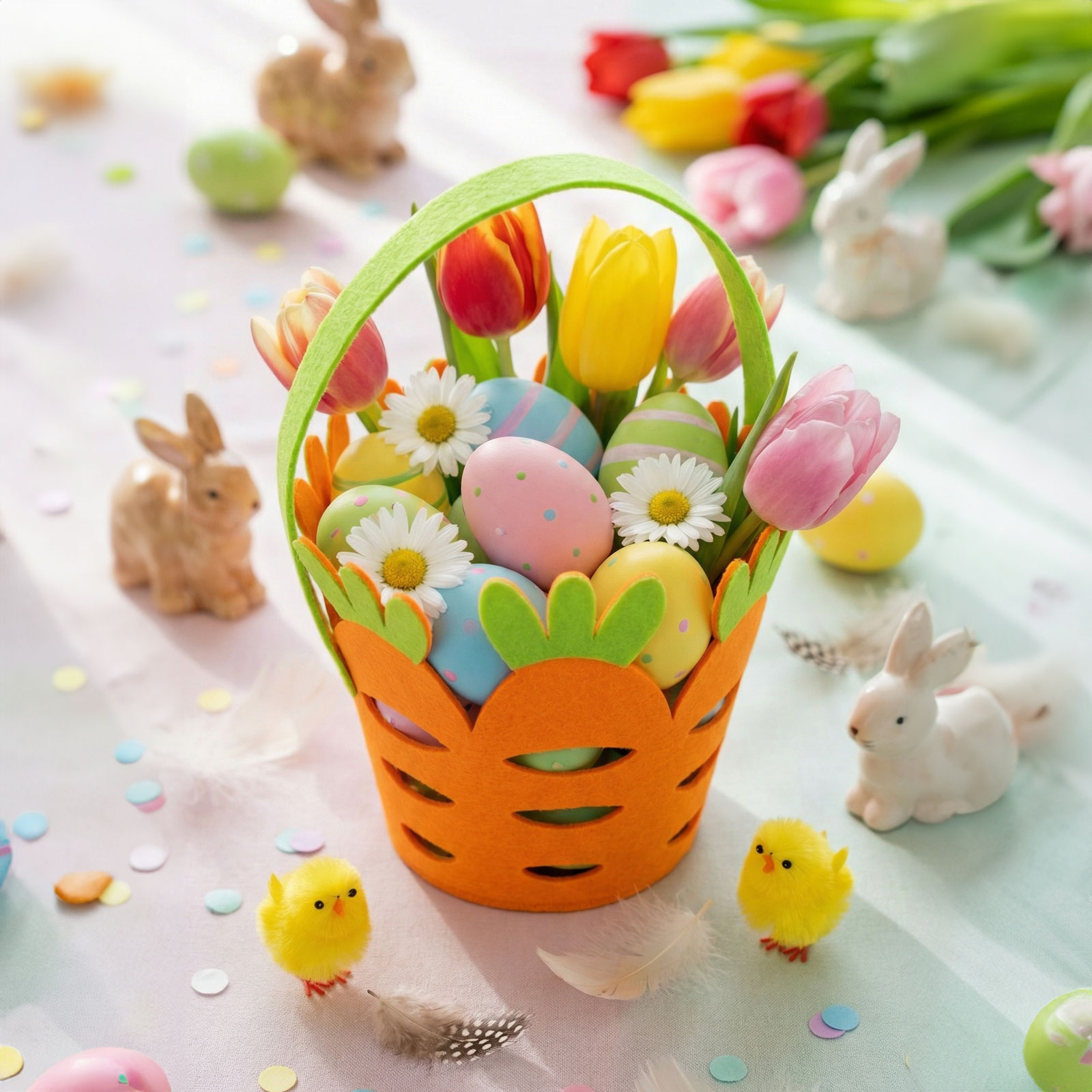 Zpříjemněte si Velikonoce s tímto originálním filcovým košíkem ve tvaru mrkve! Košík je vyroben v zářivě oranžové a zelené barvě a je vybaven praktickým držadlem. Ideální na sbírání velikonočních vajíček, sladkostí, drobných dárků nebo jako součást sváteční dekorace. Lehký, ale odolný filcový materiál vytváří veselou, jarní atmosféru v každé domácnosti.