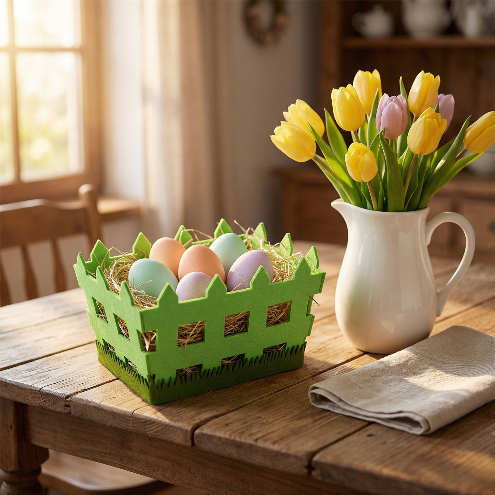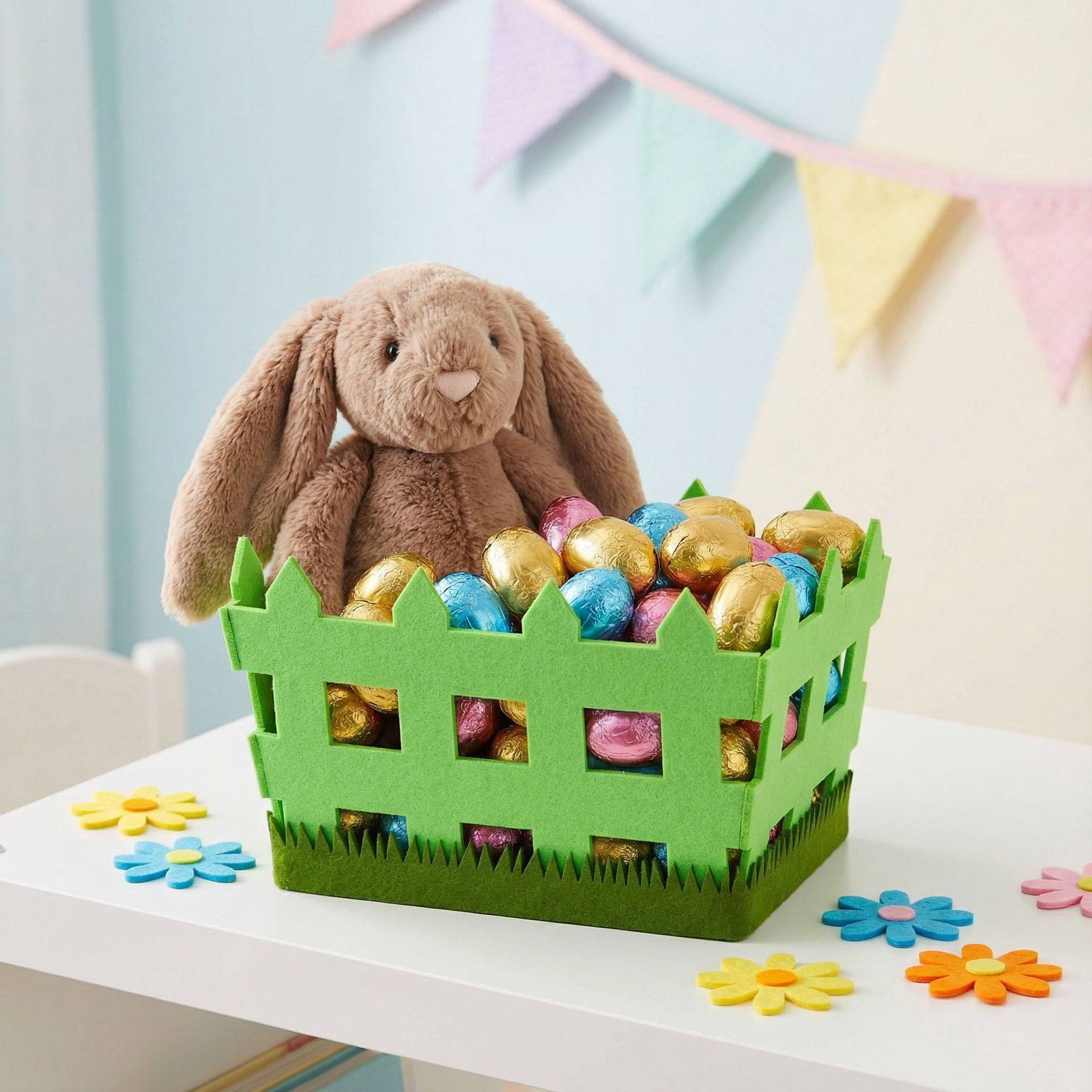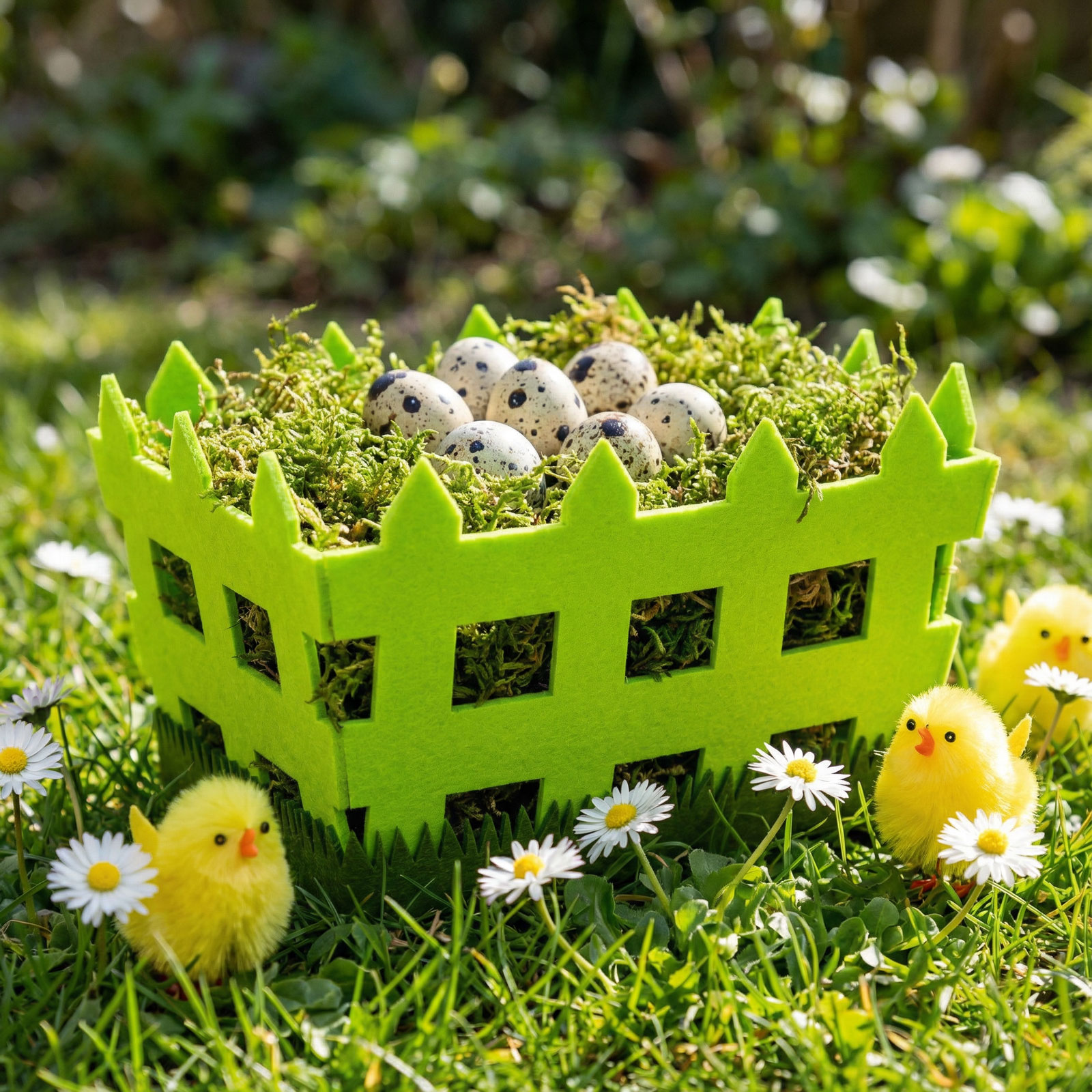 Oživte svou velikonoční výzdobu tímto jedinečným filcovým košíkem ve tvaru plotu! Košík je ideální pro uskladnění a podávání sladkostí, drobných dárků nebo velikonočních vajíček. Filcový materiál je lehký, ale zároveň odolný a tvar plotu dodává dekoraci veselý, jarní nádech. Perfektní doplněk na sváteční stůl, dárkové koše nebo jakoukoli velikonoční dekoraci.