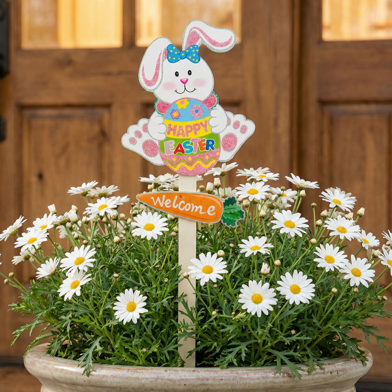 Oživte svou zahradu nebo domov touto veselou velikonoční dekorací! Králíček z třpytivé pěnové hmoty drží barevné vajíčko s nápisem „Happy Easter“. Díky zapichovacímu provedení se jednoduše umisťuje do země, a proto je ideální na ozdobení záhonů, květináčů nebo zahradních chodníčků. Zářivé barvy a milý motiv králíčka zaručeně navodí sváteční atmosféru.