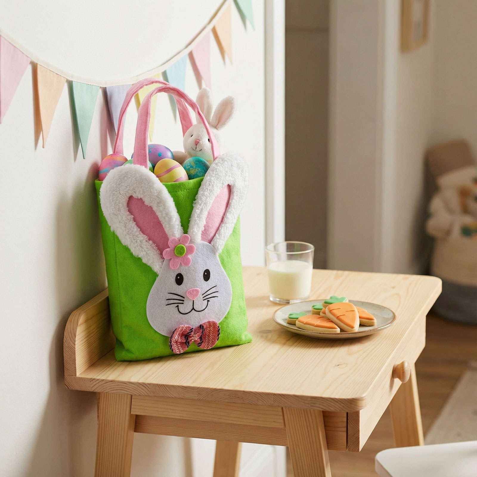 Vneste veselou atmosféru do velikonočních příprav s touto roztomilou filcovou taškou se zajíčkem! Taška je vyrobena z měkkého filcu a polyesteru, zdobená roztomilým motivem zajíčka a nadýchanými oušky. Dostupná je ve dvou barvách – zelené a růžové. Ideální volba pro děti na sbírání velikonočních vajíček, čokolády nebo dárků, ale skvěle poslouží i jako sváteční dekorace. Díky pevnému provedení si dlouhodobě zachovává svůj tvar.