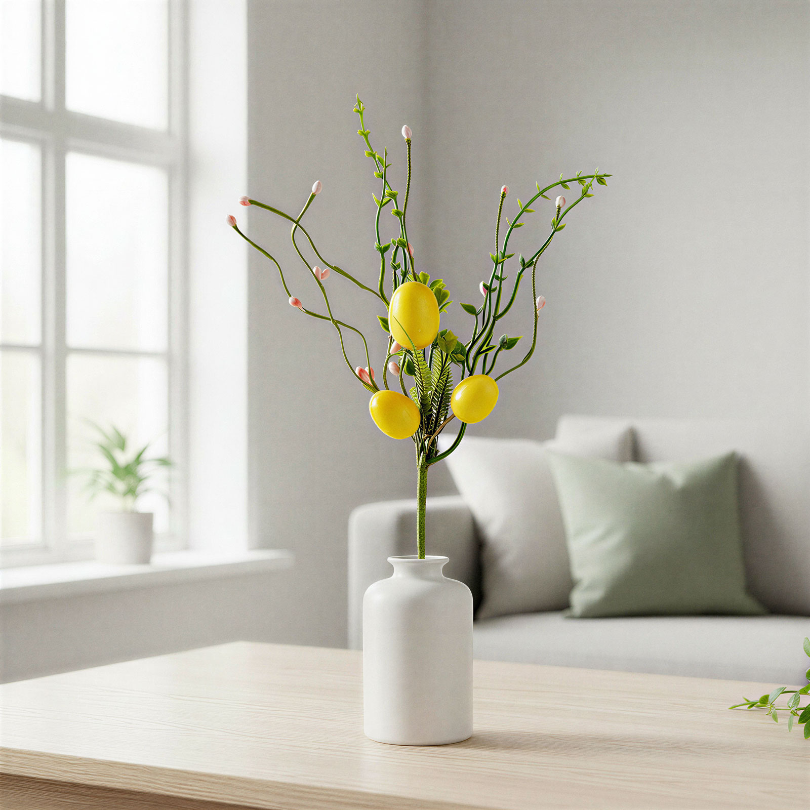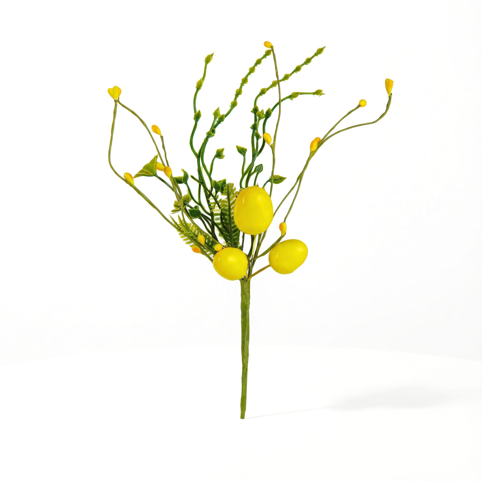 Tato dekorativní velikonoční větvička s vajíčky je ideální volbou pro jarní a velikonoční výzdobu vašeho domova. Větvička zdobená žlutými vajíčky a zelenými listy vytváří veselou a sváteční atmosféru, která se skvěle hodí do stolních aranžmá, věnců, váz nebo dokonce jako dekorace na dárkové balíčky. Větvička s realistickým vzhledem je vyrobena z odolného materiálu, takže ji lze používat opakovaně každý rok. Díky detailnímu zpracování harmonicky ladí s ostatními jarními dekoracemi a oživí každý domov nebo kancelář.