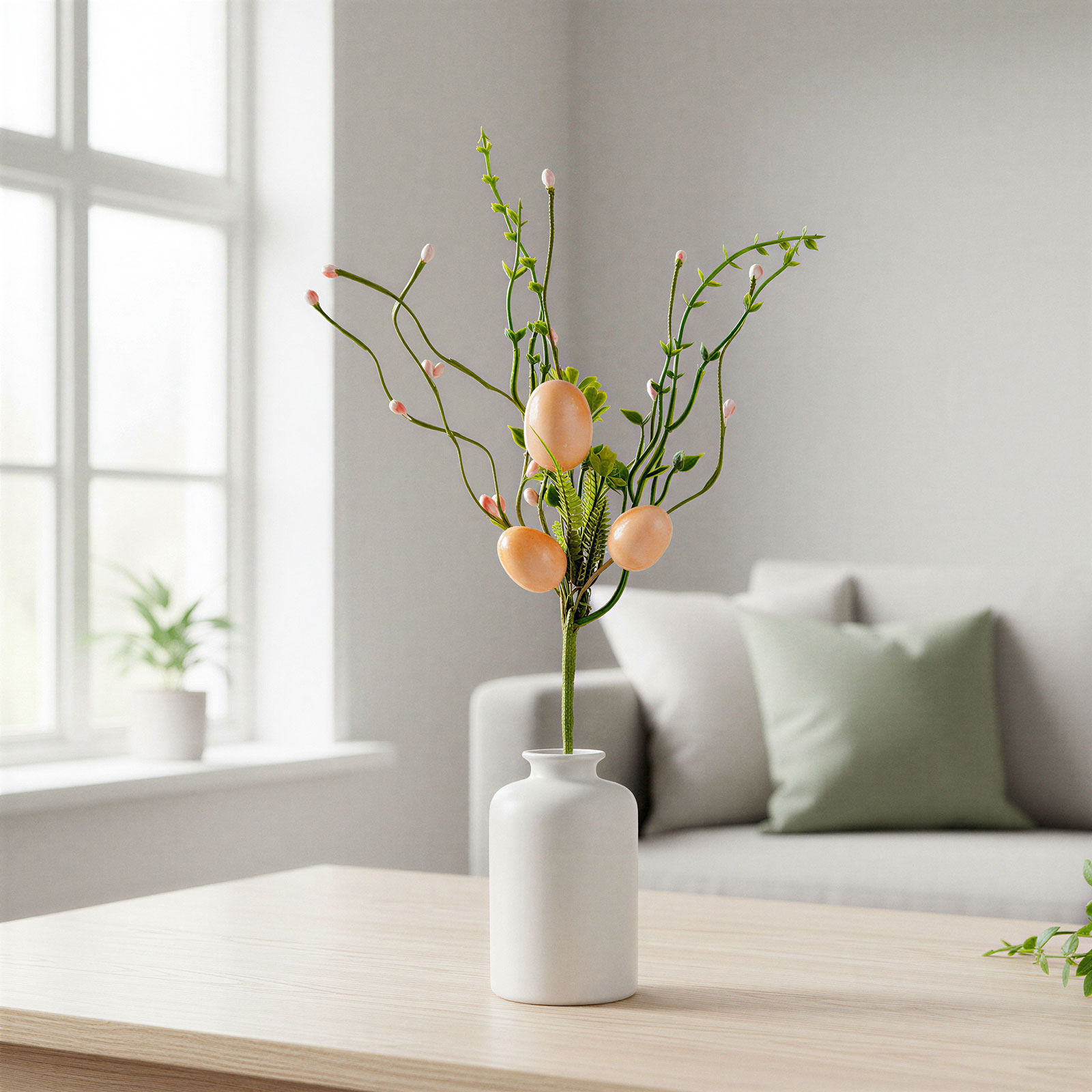 Tato dekorativní velikonoční větvička s vajíčky je ideální volbou pro jarní a velikonoční výzdobu vašeho domova. Větvička zdobená růžovými vajíčky a zelenými listy vytváří veselou a sváteční atmosféru, která se skvěle hodí do stolních aranžmá, věnců, váz nebo dokonce jako dekorace na dárkové balíčky. Větvička s realistickým vzhledem je vyrobena z odolného materiálu, takže ji lze používat opakovaně každý rok. Díky detailnímu zpracování harmonicky ladí s ostatními jarními dekoracemi a oživí každý domov nebo kancelář.