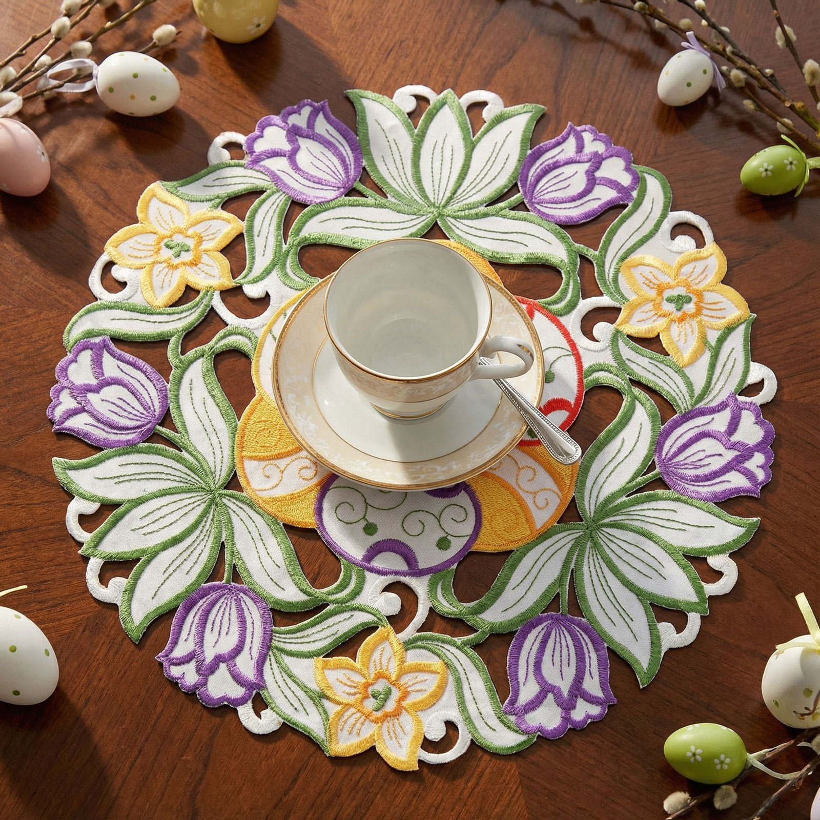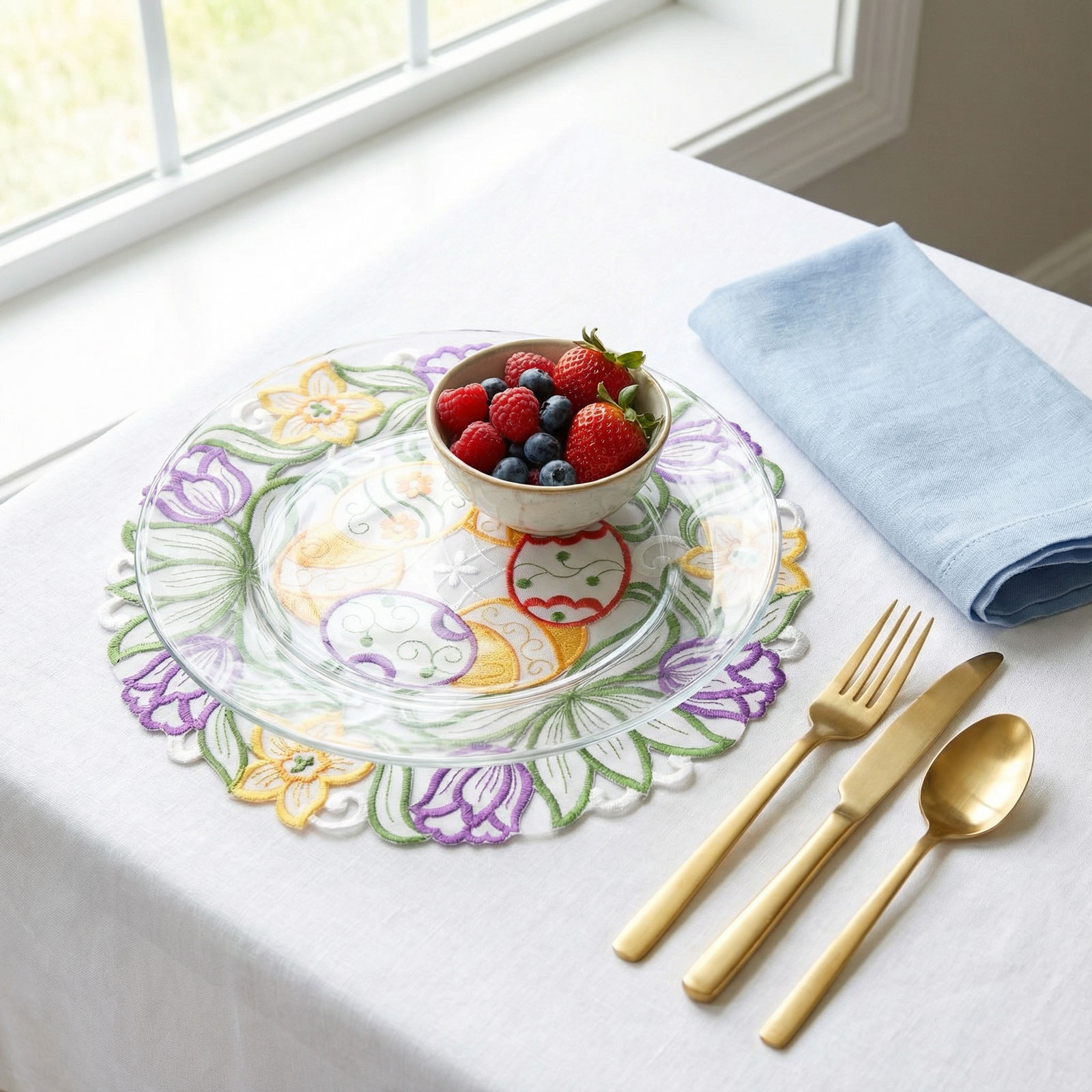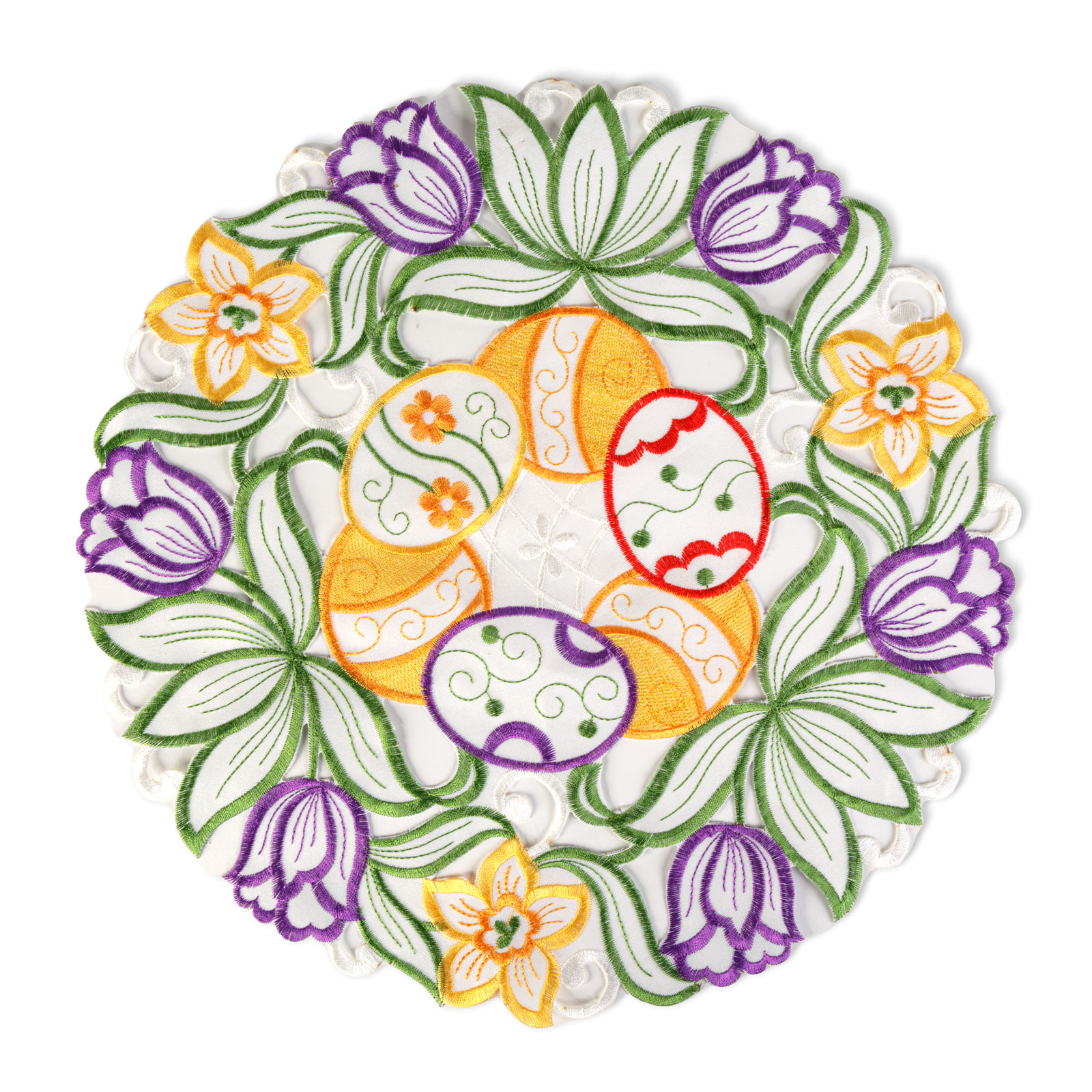 Tento krásný vyšívaný velikonoční prostírání vytváří na vašem stole jedinečnou sváteční atmosféru. Barevné vzory vajíček uprostřed a jarní květinové motivy po obvodu dodávají elegantní a veselý vzhled. Díky detailnímu vyšívání je prostírání nejen praktické, ale také dekorativní a představuje ideální volbu pro vaše velikonoční stolování.