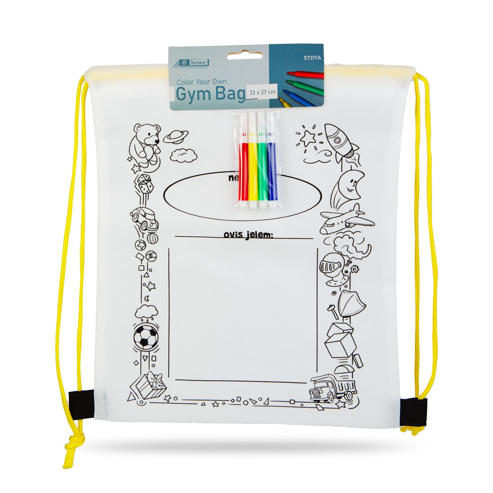 Vybarvěte si vlastní sportovní vak, batoh se sadou barevných fixů. Dva v jednom: sportovní vak a zábavná aktivita pro děti. Při vybarvování vložte mezi dvě vrstvy materiálu vaku silnější papír, aby se barva nedostala na zadní stranu.