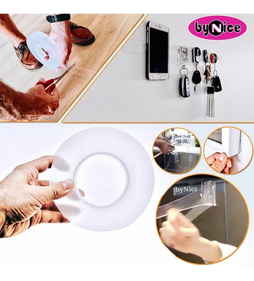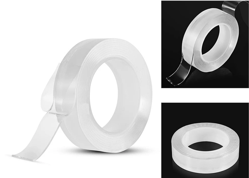 Tato oboustranná lepící páska je vyrobena z nanoakrylového gelu, průhledná a elastická, snadno se odstraňuje a nezanechává žádné stopy na stěně ani na povrchu připevněného předmětu.